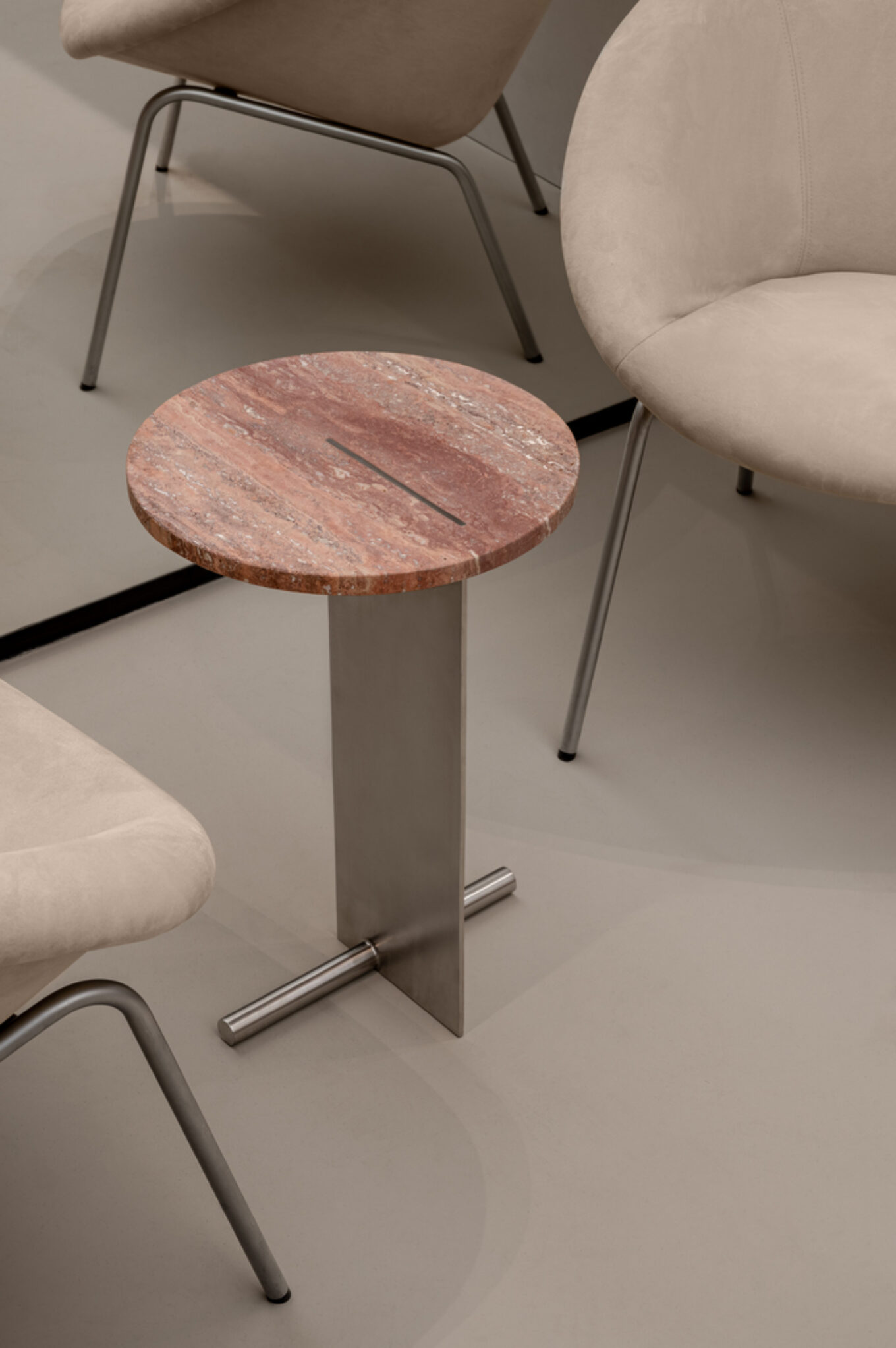 «Для оздоблення центральної стіни ми обрали натуральний камінь — червоний травертин, змінивши його оригінальний тон за допомогою техніки ручного матування. Щоб створити ефект природного зламу каменю, край обробляли вручну. Рішення з травертином є не тільки естетичним, але й функціональним. Якби там, де розміщені робочі місця стилістів, ми просто пофарбували стіну в той самий пісочний відтінок, що й увесь інтер’єр, ця зона швидко втратила б свій естетичний вигляд через механічні ушкодження і сліди бруду. А так натуральний камінь захищає стіну в зоні ніг. До того ж ми передбачили там підніжки, виконані з неіржавної сталі та вкручені безпосередньо у травертинову плиту», — розповідають авторки проєкту.
