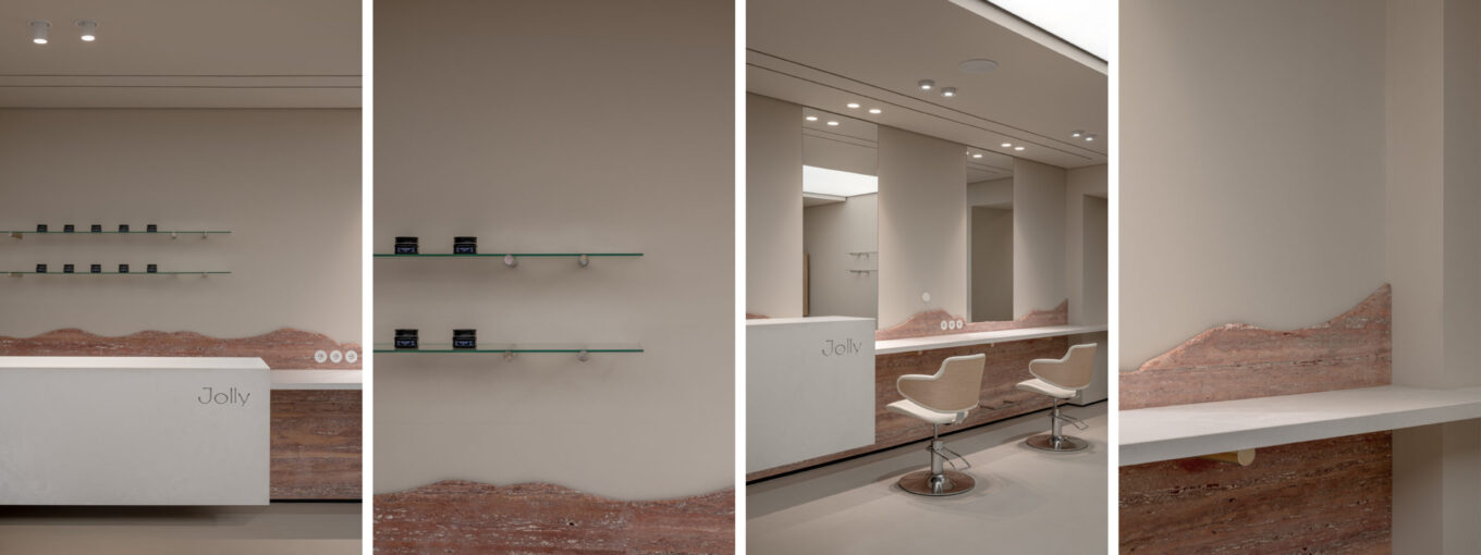 Справді, інтер’єри салону витримані у світлій пісочній гамі, подекуди доповненій металевими деталями й акцентними фактурами натурального каменю. Гармонійний та збалансований інтер’єр, не перевантажений зайвим декором, водночас навіює атмосферу просторих елегантних холів у курортних готелях і глиняних домівок у теплих містечках — затишних, світлих, сповнених спокою. Поєднуючи в собі найкраще від кожної із цих асоціацій, Jolly Beauty Salon постає перед гостями ідеальним місцем, де можна побути наодинці із собою, дбаючи про себе, даючи собі час, аби нікуди не поспішати, вдихнути, видихнути.