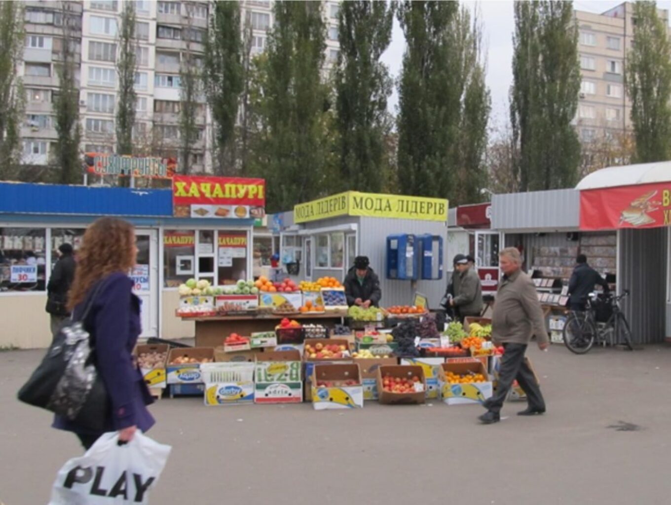Приклад локального ринку у спальному районі: нестандартизовані кіоски та вуличні прилавки. Фото: Георгій Максименко