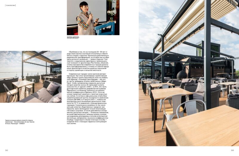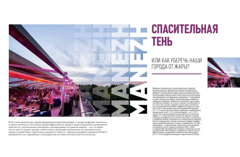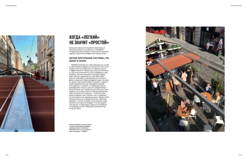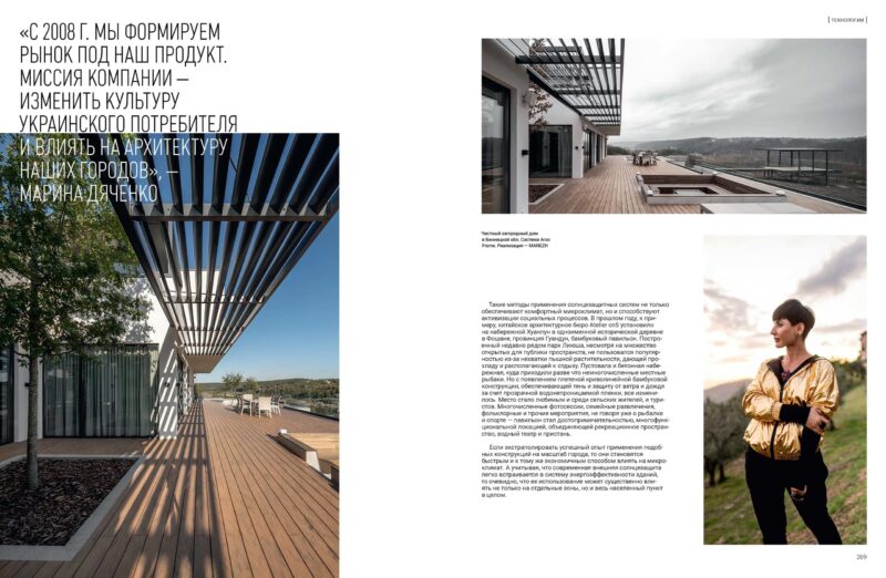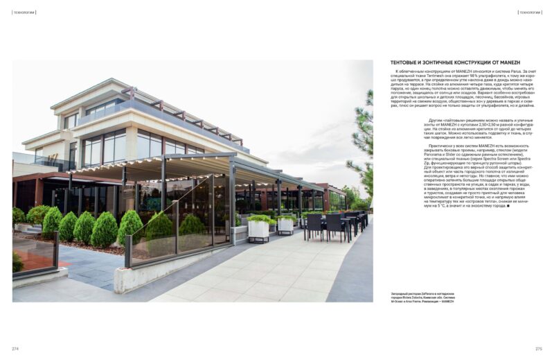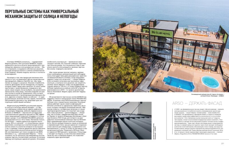 «Системы MANEZH уникальны, — подчеркивает Марина Дяченко, CEO компании MANEZH, лидера украинского рынка в области проектирования и производства наружных солнцезащитных систем. — Мы не копировали, а создавали собственные решения, улучшив западные аналоги с учетом климатической зоны Украины: объема осадков, частоты и плотности их выпадения».
