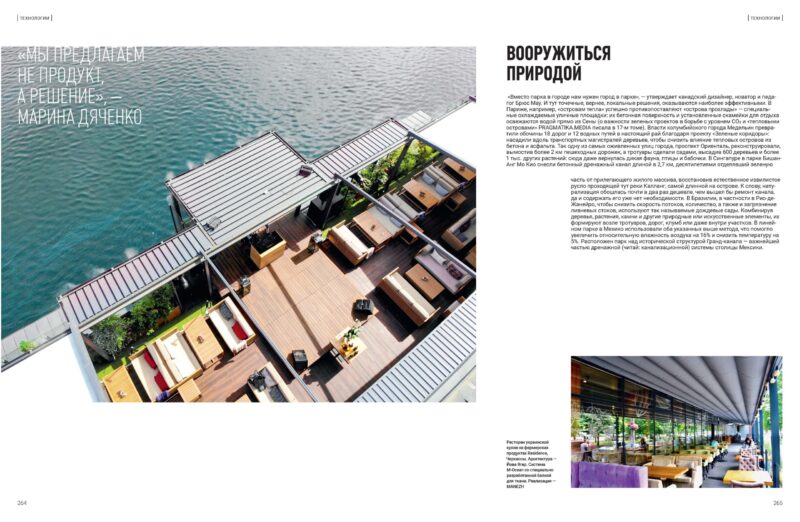 «Вместо парка в городе нам нужен город в парке», — утверждает канадский дизайнер, новатор и педагог Брюс Мау. И тут точечные, вернее, локальные решения, оказываются наиболее эффективными. В Париже, например, «островам тепла» успешно противопоставляют «острова прохлады» — специальные охлаждаемые уличные площадки: их бетонная поверхность и установленные скамейки для отдыха освежаются водой прямо из Сены (о важности зеленых проектов в борьбе с уровнем CO2 и «тепловыми островами» PRAGMATIKA.MEDIA писала в 17-м томе).