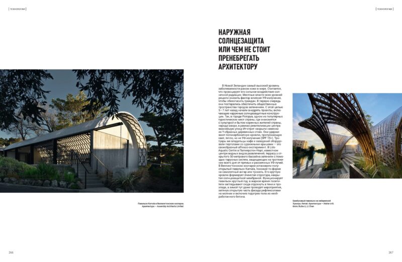 Такие методы применения солнцезащитных систем не только обеспечивают комфортный микроклимат, но и способствуют активизации социальных процессов. В прошлом году, к примеру, китайское архитектурное бюро Atelier cnS установило на набережной Хуанлун в одноименной исторической деревне в Фошане, провинция Гуандун, бамбуковый павильон. Построенный недавно рядом парк Лиюша, несмотря на множество открытых для публики пространств, не пользовался популярностью из‑за нехватки пышной растительности, дающей прохладу и располагающей к отдыху. Пустовала и бетонная набережная, куда приходили разве что немногочисленные местные рыбаки. Но с появлением плетеной криволинейной бамбуковой конструкции, обеспечивающей тень и защиту от ветра и дождя за счет прозрачной водонепроницаемой пленки, все изменилось. Место стало любимым и среди сельских жителей, и туристов. Многочисленные фотосессии, семейные развлечения, фольклорные и прочие мероприятия, не говоря уже о рыбалке и спорте — павильон стал достопримечательностью, многофункциональной локацией, объединяющей рекреационное пространство, водный театр и пристань.