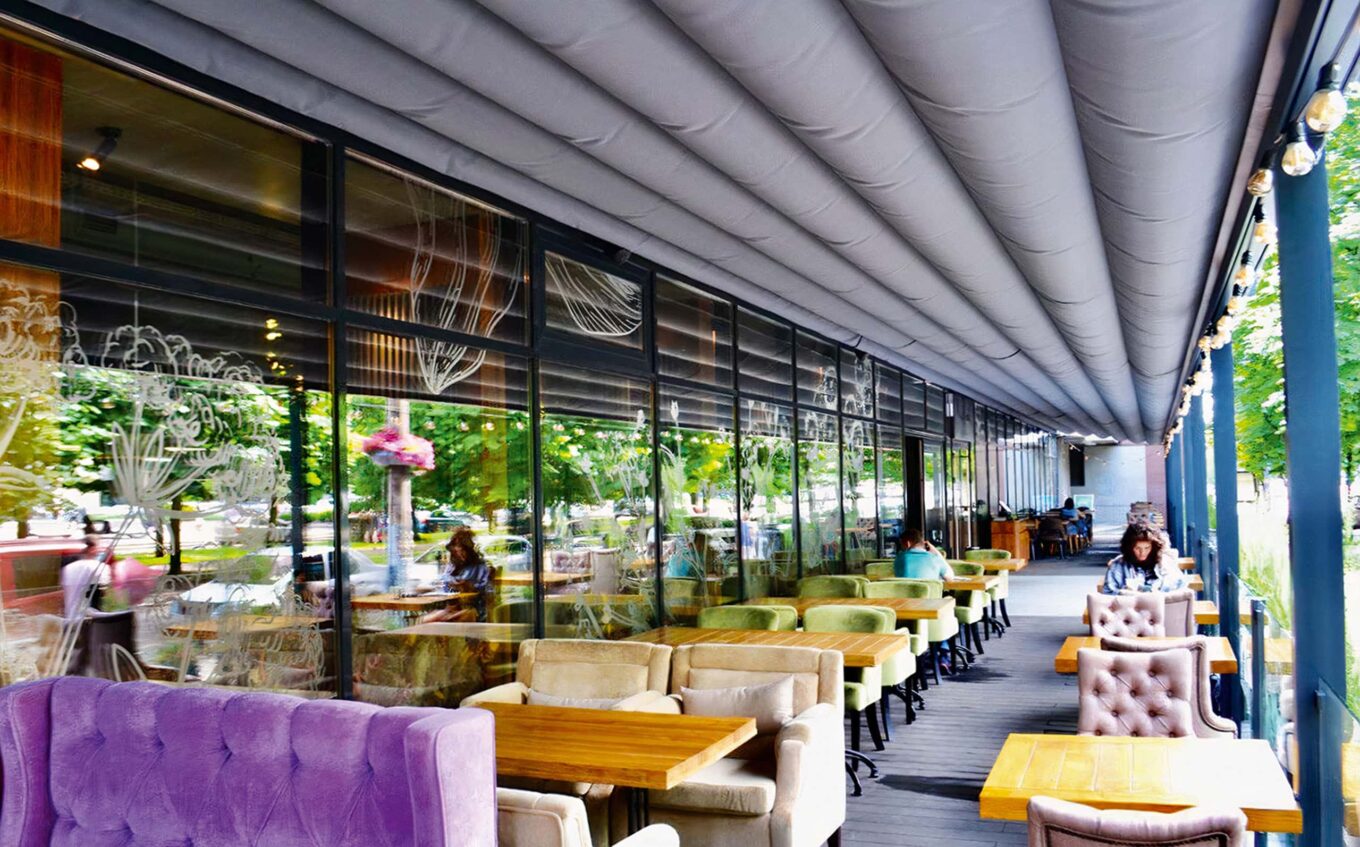 Практически у всех систем MANEZH есть возможность закрывать боковые проемы, например, стеклом (модели Panorama и Slider со сдвижным рамным остеклением), или специальной тканью (серия Spectra Screen или Spectra Zip, функционирующие по принципу рулонной шторы). Для проектировщика это верный способ защитить конкретный объект или часть городского полотна от излишней инсоляции, ветра и непогоды. Но главное, что ими можно оперативно затенять большие площади открытых общественных пространств на улицах, в садах и парках, у воды, в заведениях, в популярных местах скопления горожан и туристов, создавая не просто приятный для человека микроклимат в конкретной точке, но и напрямую влияя на температуру тех же «островов тепла», снижая ее минимум на 5 °C, а значит и на экосистему города.