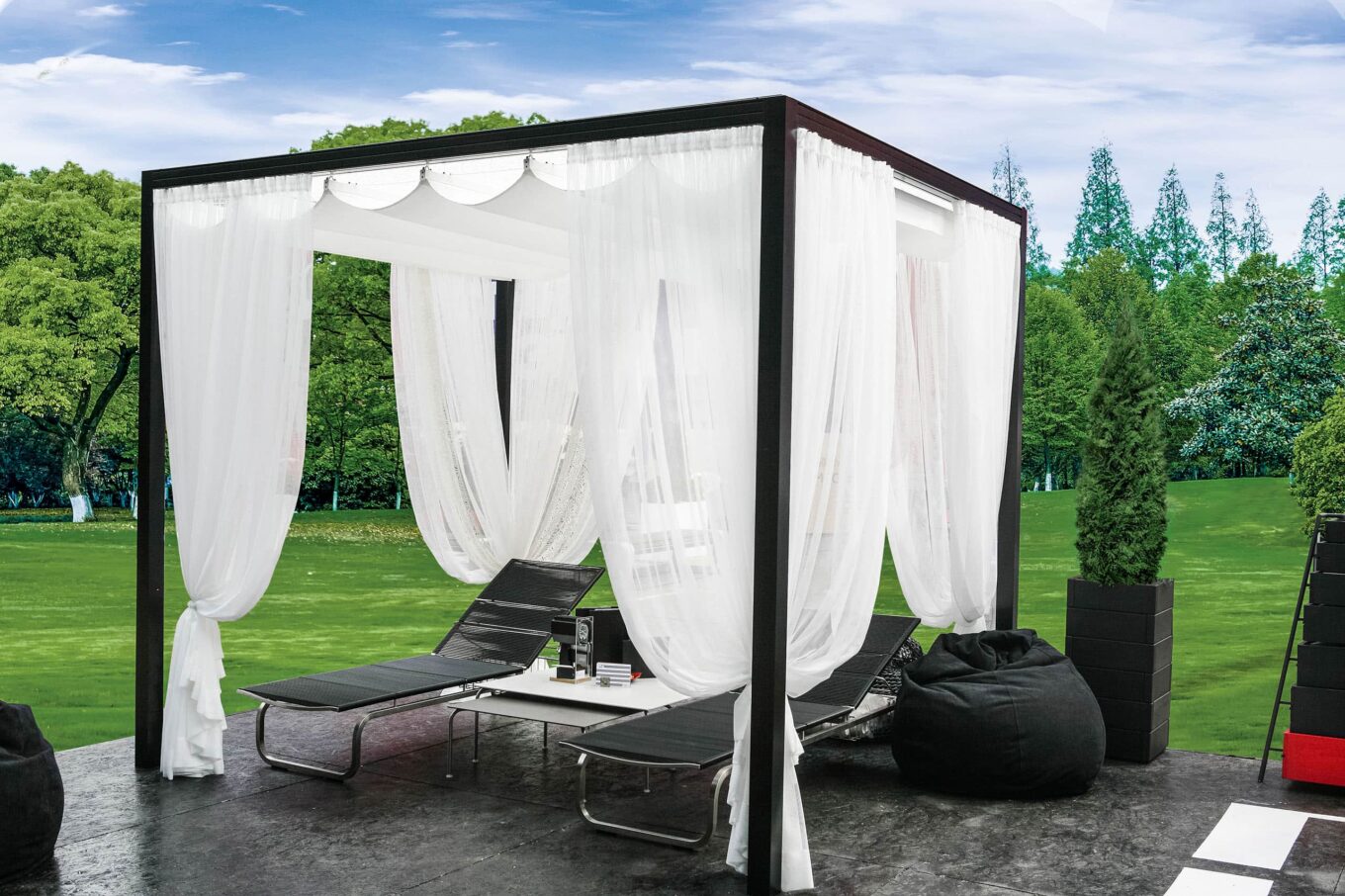 Идеальным вариантом для отдыха в тени у моря или бассейна, одним словом, у воды и не только, станет новая система Sweet от MANEZH. Это легкая пергола со сдвижной тканевой кровлей, выполненной с небольшими провисами. Данная модель типового размера 3 × 2 м выдерживает ветровую нагрузку, сравнимую с разрешенной скоростью движения автомобилей в наших городах (до 50 км / ч). Внутри размещают столик со стульями или креслами либо же пару удобных шезлонгов, а для создания более интимной обстановки боковые проемы можно закрыть элегантными шторами. Такой вариант защиты от солнца подойдет как для частных объектов, так и для оформления пляжных зон отдыха, территории курортных комплексов и парков, летних террас ресторанов и кафе.
