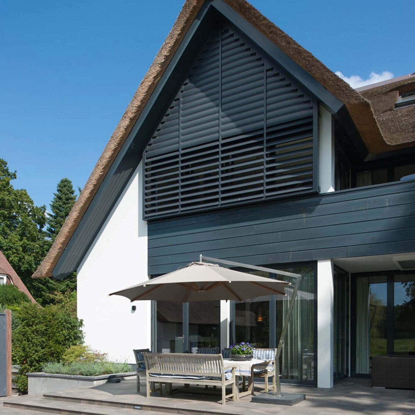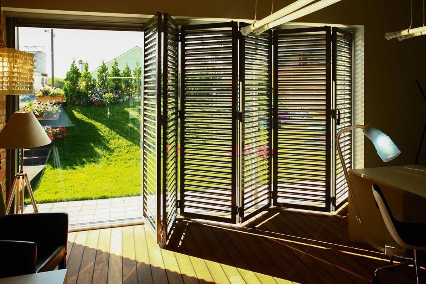 Система ARSO SHUTTERS FOLDER сдвигается по принципу книжки или ширмы, позволяя максимально открывать пространство на террасе, балконе, фасаде здания одним легким движением. А версия ARSO SHUTTERS FIXED, напротив, фиксируется стационарно. Например, архитектор Ольга Богданова использовала ее для накрытия обзорной террасы у моста в проекте загородного дома в Винницкой области Vin House.