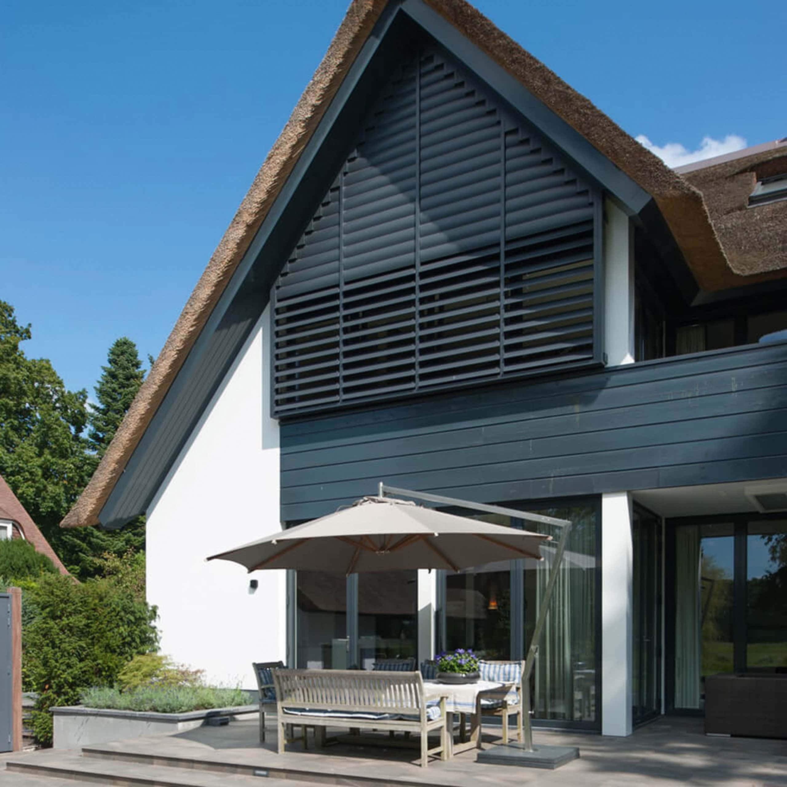 Первым внешним средством защиты дома от яркого солнца были оконные ставни. Они несли в себе как декоративную функцию (изучению их художественного исполнения в нашей традиции и в других странах посвящены целые исследования), так и практическую: регулировали микроклимат и температуру внутри комнат, спасая от духоты, а также защищали от ветра, снега, дождя и даже от взлома и проникновения. С развитием технологий они постепенно превратились в целые конструктивные солнцезащитные элементы жилой и не только архитектуры.