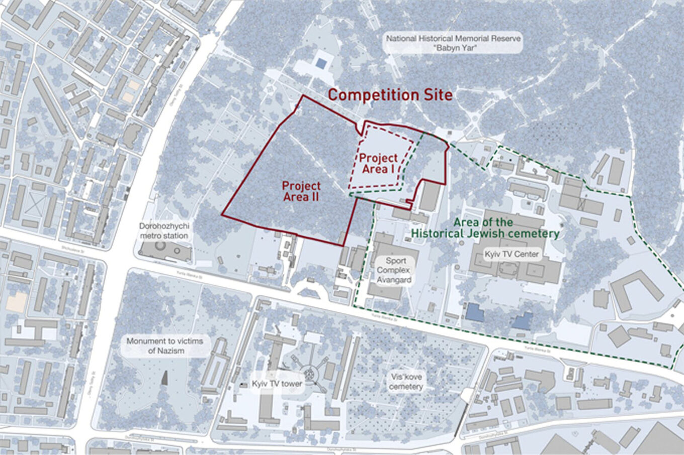 Яна Баринова, исполнительный директор и директор по стратегии BYHMC, комментирует ситуацию с кладбищем так: «Сегодня существует единое мнение о расположении еврейского кладбища. Оно заходит на участок, который находится в аренде нашего фонда и является частью мемориального пространства. Мы должны будем оградить его, что также является составляющей конкурсного задания для архитекторов. Все происходит под наблюдением раввинов Украины, Европейского союза и Израиля».