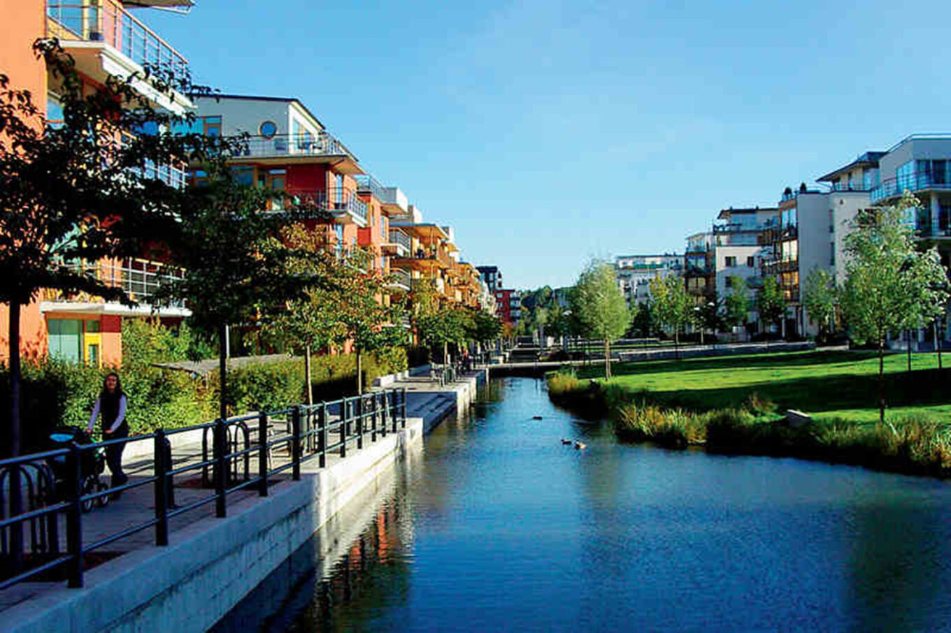 Житлові будинки в Miasteczkо Wilanów підходять впритул до каналу. Фото: Miasteczkо Wilanów / Facebook