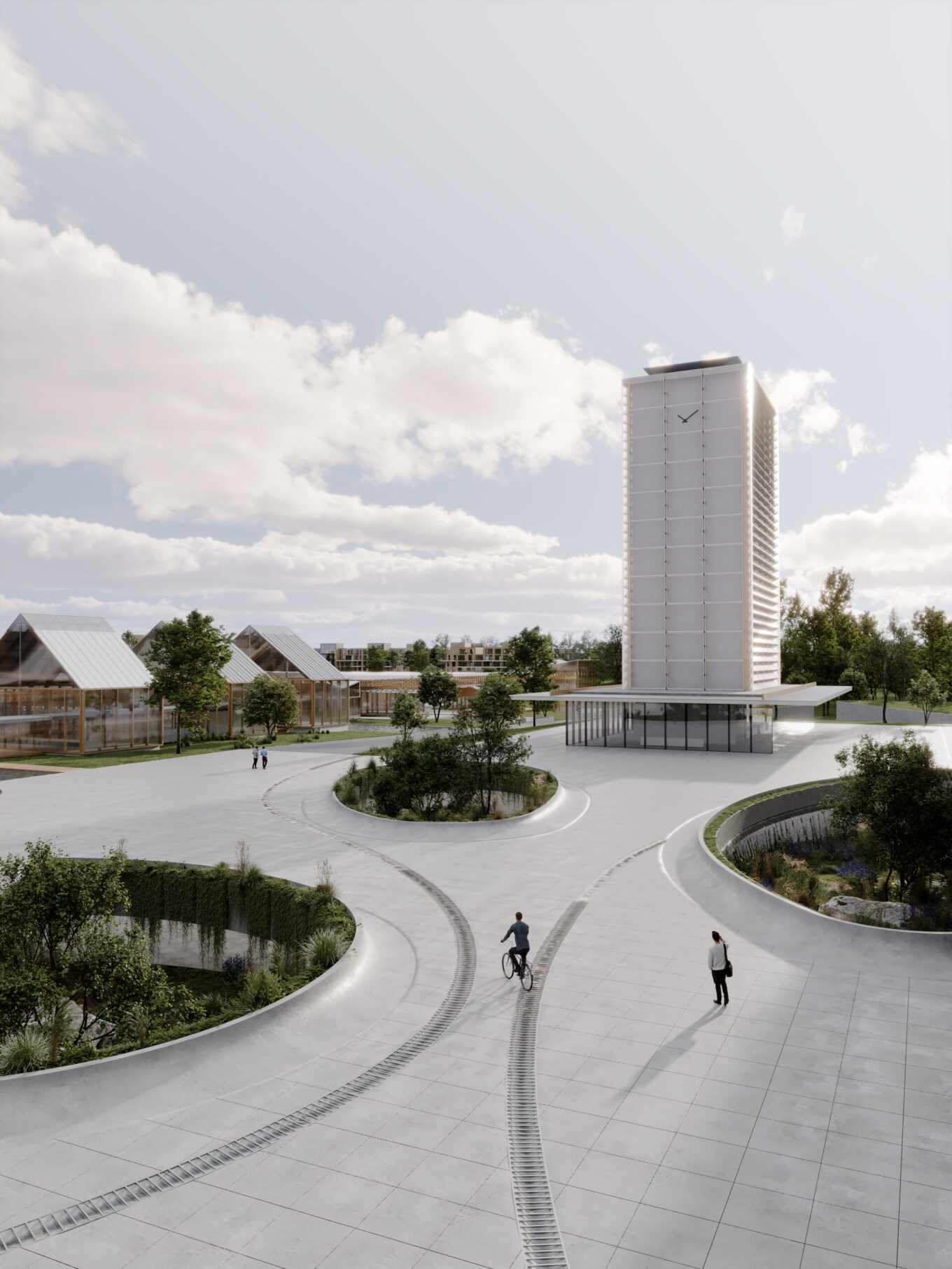 Я. К.: Так. У нас на центральній площі розміщена вертикальна теплиця з годинником, вона — ніби маяк для мешканців і гостей, що цілодобово вказує на центр, також вона дуже технологічна та важлива для продуктової безпеки міста. Гі, зокрема, здивувало, чому ми розташували горизонтальний тепличний комплекс у центрі урбанізації Vlasne Misto. Адже традиційно центр — це найвигідніше місце для комерційних об’єктів і житла. Але справа в тому, що технологічно теплиці мають охоронну зону, яка може бути зайнята комерційними об’єктами, але за законодавством не може бути зайнята житловими об’єктами. Другий момент — якби ми посунули теплицю на околицю, то вона не працювала б як місце тяжіння, і комерційні павільйони були б нераціональними. А розташувавши її в центрі, ми одночасно демонструємо цінність зайнятості з вирощування рослин, цінність локального продукту, залучаємо до цього захоплюючого процесу всіх жителів, а головне — тепличний комплекс працює як великий очисник повітря, фільтруючи з повітря 7000 тонн CO₂ на рік (це заміна 300 тис. дерев), а ще — 8000–9000 тонн CO₂, отриманого з очисних споруд! Враховуючи, що під теплицею будуть розташовані продовольчі склади та укриття, системи резервування електроенергії Storage і ТЕЦ, ми одразу вирішуємо питання безпеки та товарообігу під землею. Також нами запроєктований енергоефективний обмін між тепличним комплексом і будівлями навколо, між блоками розташовані, крім торгових павільйонів, і громадські, рекреаційні площі. Так, наш проєкт революційний. У Європі є об’єкти, де на першому поверсі розташований логістичний центр, а на дахах — теплиці. Але в нас теплиця — це первинне, решта — навколо неї.