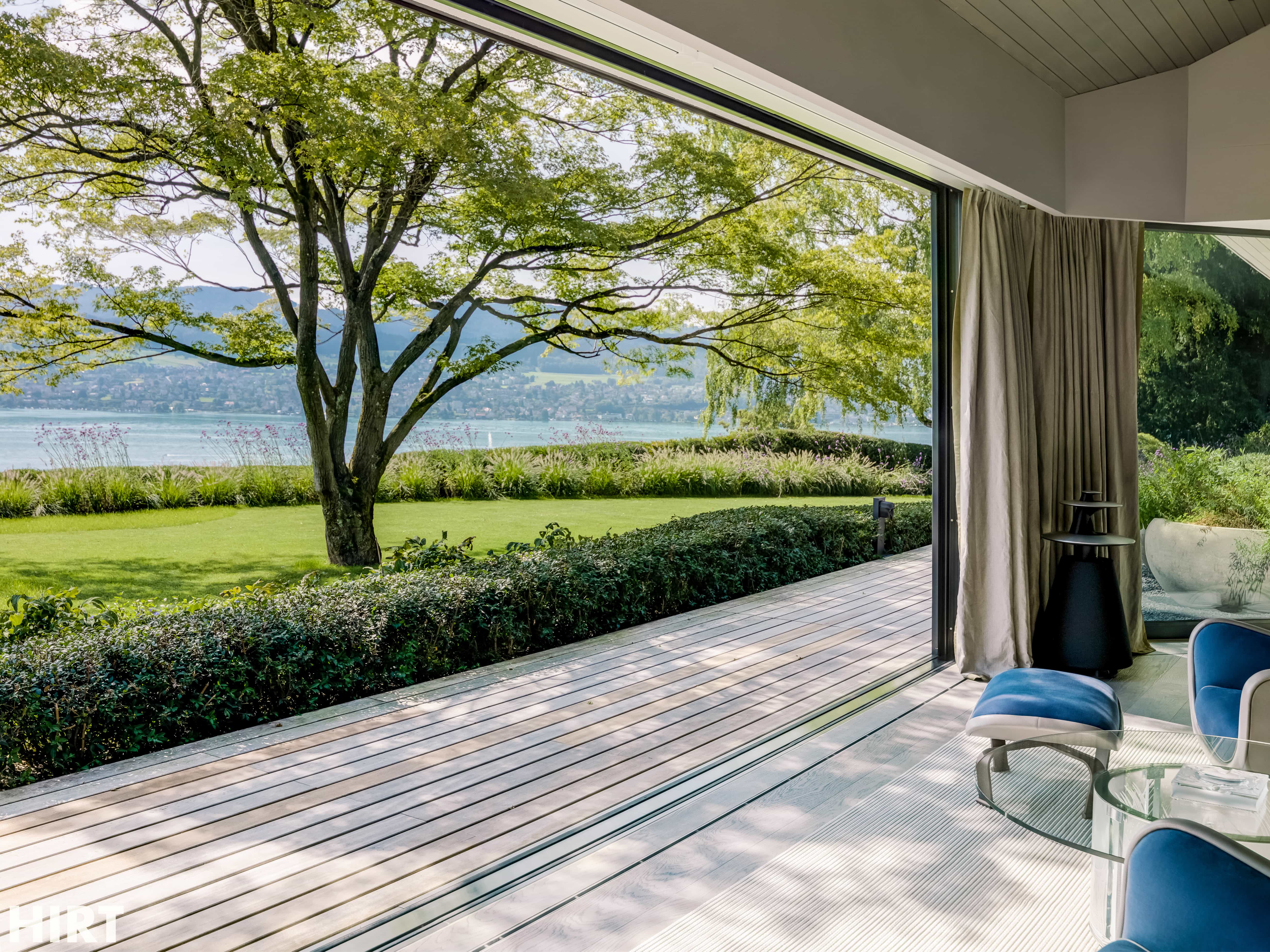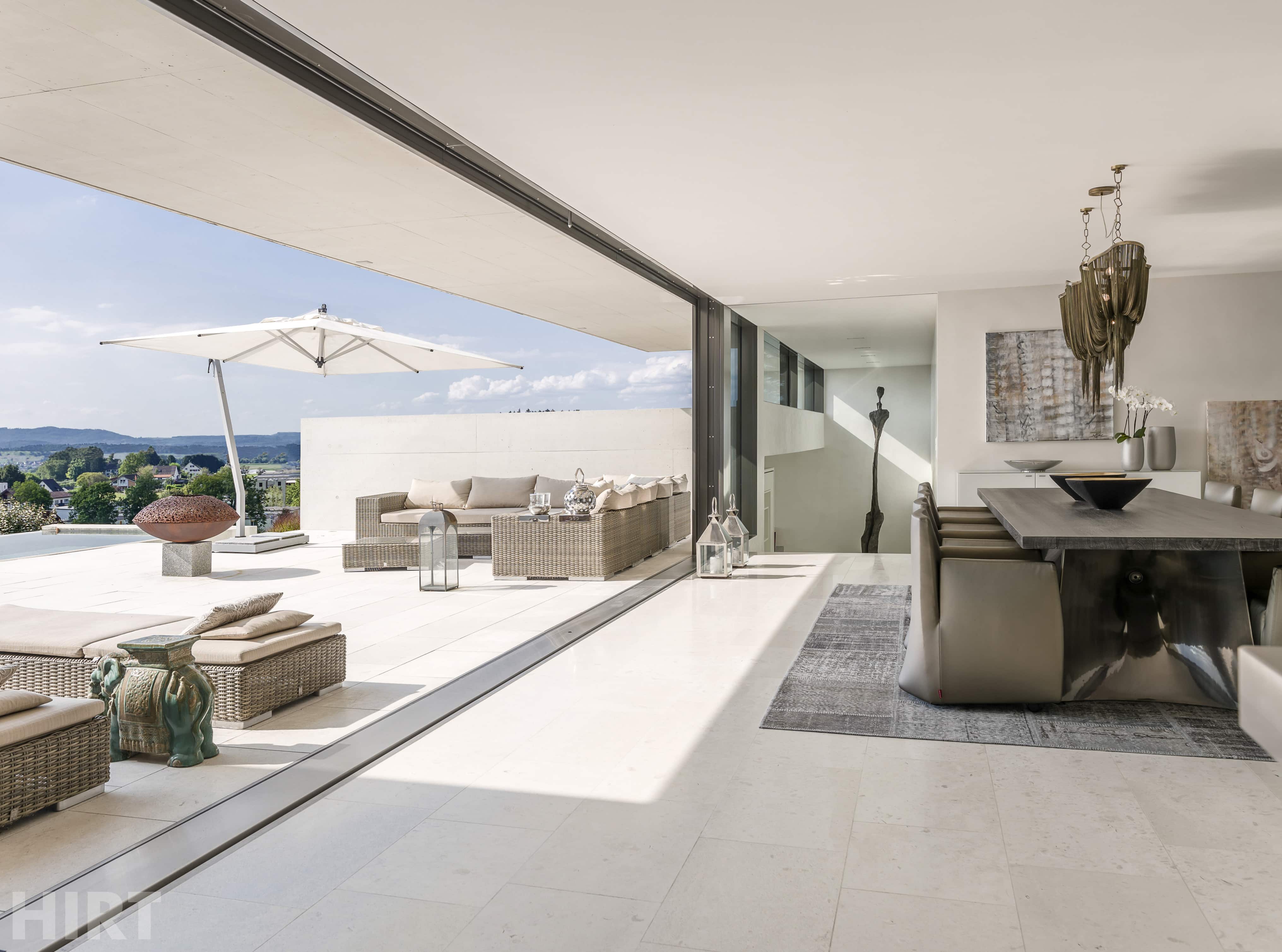 Сегодня принцип взаимопроникновения внутреннего и внешнего идеально реализуется с помощью опускающихся фасадов HIRT. До их появления эту задачу частично решали раздвижные стеклянные перегородки, но и они сохраняли барьеры между ландшафтом и интерьером — окна и стены. Компания HIRT разработала не имеющую аналогов в мире конструкцию из алюминиевых профилей и стекла. Система интегрируется в структуру здания и приводится в движение электромеханическим приводом. А выглядит все это просто фантастически: одно нажатие кнопки – и огромные панорамные окна или прозрачные стены, бесшумно скользя, исчезают в полу, а все, что находится внутри и снаружи помещения, становится единым жилым пространством.