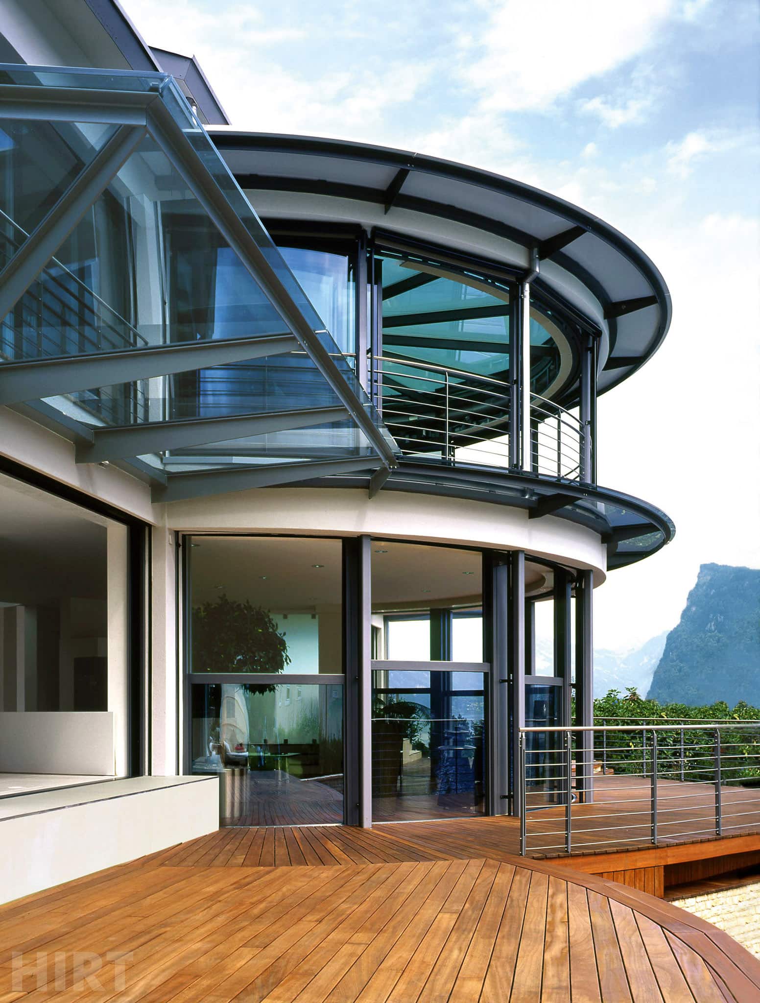 Компания HIRT разработала не имеющие аналогов в мире фасадные опускающиеся конструкции, позволяющие также работать со сложными изогнутыми и радиальными поверхностями. Частный дом, Люцерн, Швейцария
