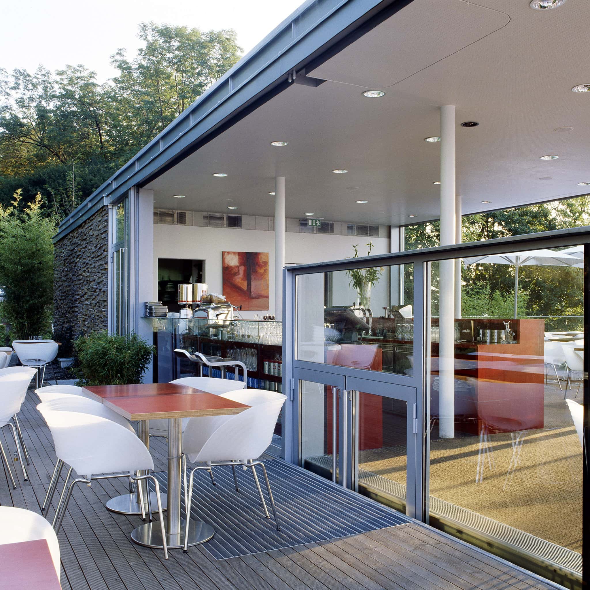 Опускающиеся фасадные конструкции, включающие встроенные в них двери — идеальное решение для объектов HoReCa. Ресторан в австрийском Граце