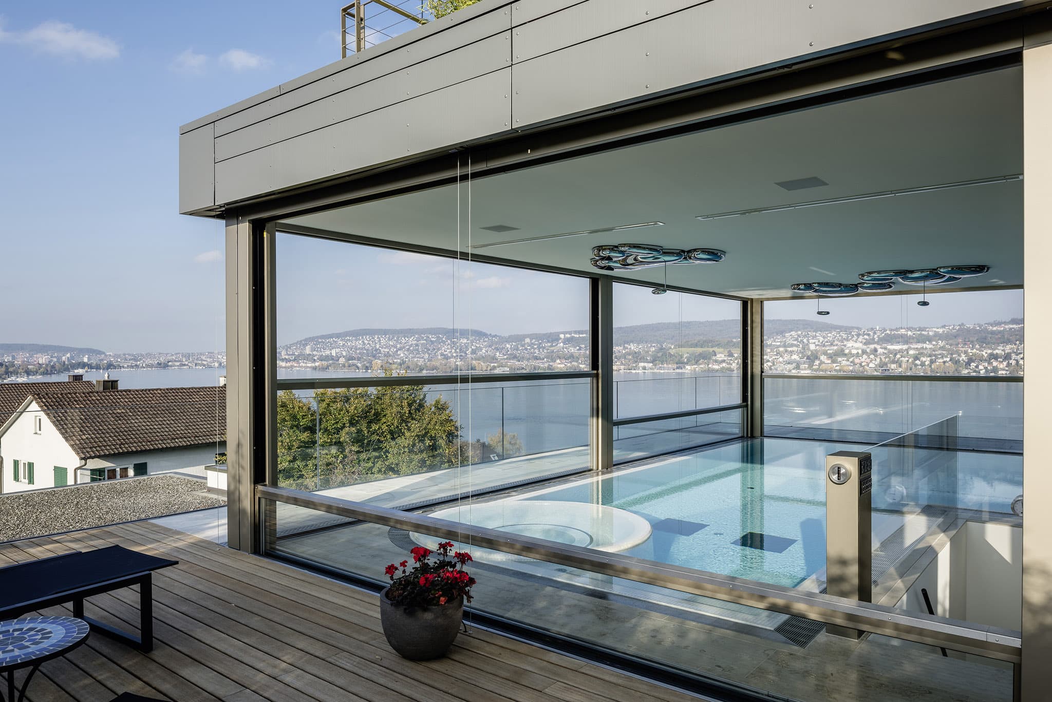 Частные апартаменты с крытым бассейном, который благодаря опускающимся фасадам легко превращается в открытый. Кильхберг, Швейцария