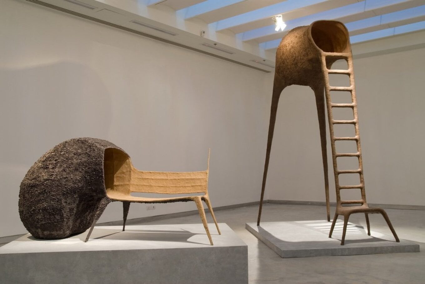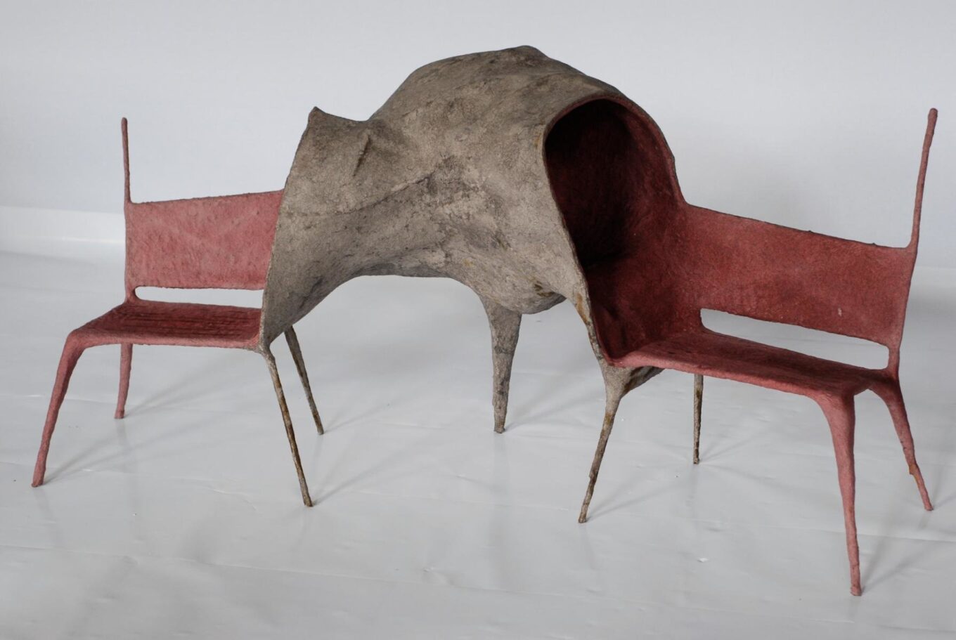 Или предметы из коллекции «Эволюция». Они сделаны из обрезков и обрывков бумаги, пропитанных чернилами и клеем, этакое папье-маше армированное металлом. Часть скамьи – кокон, в который можно спрятаться от толпы. А скамья «The lovers chair» – предлагает убежище для пары влюбленных.