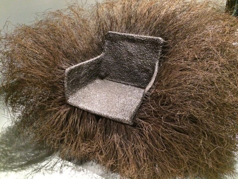 Например, “волосатая” штука, похожая на оболочку съедобного каштана на заглавной фотографии – называется «Буш из металла». Сначала мы решили, что шипы кресла-стола сплетены из мягкого текстиля (ведь не сумасшедший же этот парень, чтобы окружить себя острой проволокой!)… Но нет, Буш, действительно, из железной проволоки. Так Начо решил изолировать и защитить от вторжения извне всякого, кто сядет на стул. Основа конструкции – литой бетон, и весит это опасное для окружающих сооружение почти тонну.