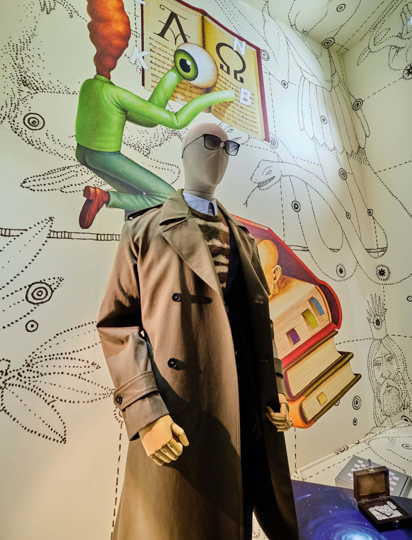 Основою сценографії стали сюрреалістичні образи, в яких переплітаються наука й містика: тигр із крилами, мавпа з червоними очима, що світяться, музичні інструменти, ігрові та геометричні фігури. Крім того, у вітринах розмістили механізовані елементи у форматі екранів із блимаючим оком, що перегукується з творчістю художника.