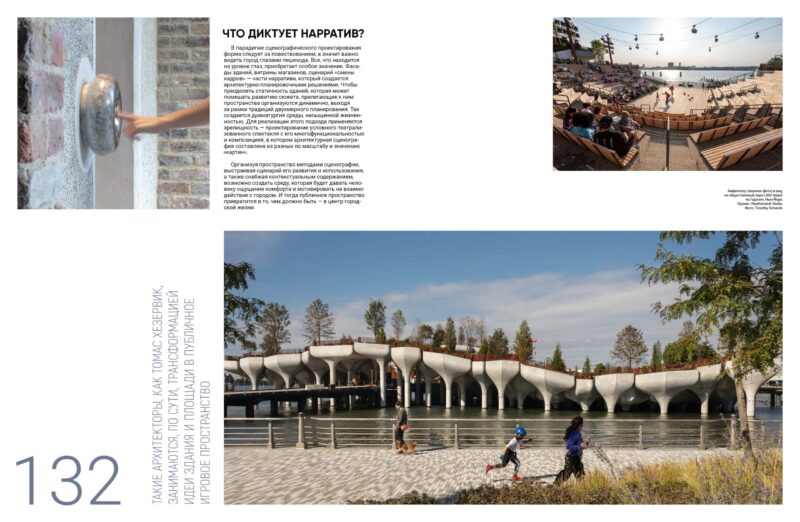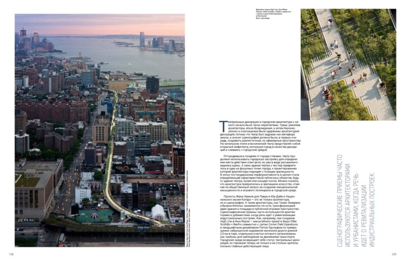 Так сталося, наприклад, під час створення High Line у Нью-Йорку (масштабного проєкту бюро Diller Scofidio + Renfro спільно з James Corner Field Operations і ландшафтним дизайнером Пітом Удольфом з перетворення занедбаної надземної залізниці завдовжки 2,3 км на парк), де окремі ділянки були організовані як трибуни спостереження за рухом транспорту. Міське середовище повертає собі статус театральних декорацій, але городяни тепер не лише глядачі, а й головні дійові особи.