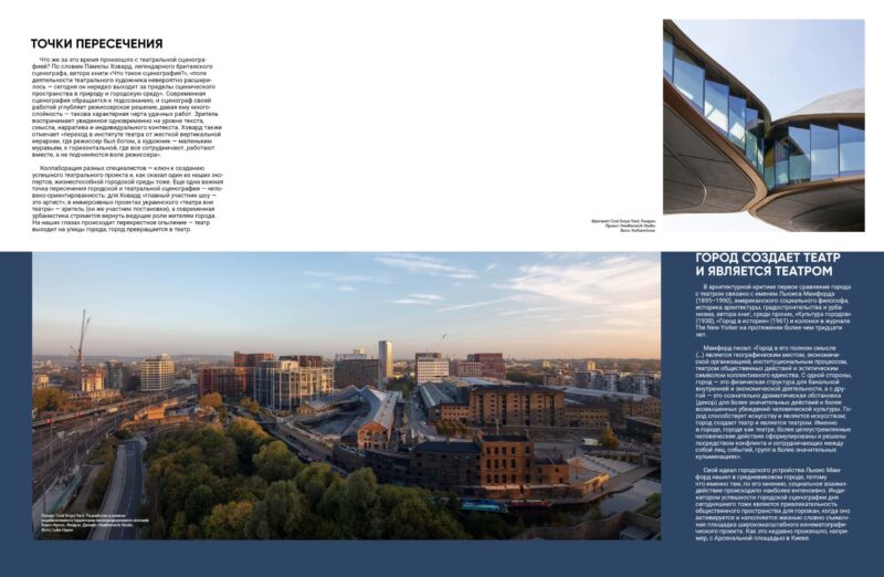 Колаборація різних фахівців — ключ до створення успішного театрального проєкту і, як сказав один із наших експертів, життєздатного міського середовища також. Ще одна важлива точка перетину міської й театральної сценографії – людиноорієнтованість: для Ховард «головний учасник шоу — це артист», в імерсивних проєктах українського «театру поза театром» — глядач (він же учасник постановки), а сучасна урбаністика прагне повернути провідні ролі мешканцям міста. На наших очах відбувається перехресне запилення: театр виходить на вулиці міста, а місто перетворюється на театр.