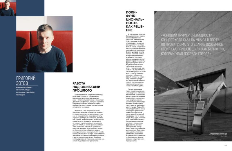 Проєктуванням таких поліфункціональних кварталів в Україні займається, зокрема, наша студія. Але в Києві є й природні квартали зі змішаною функцією, коли житло та бізнес «працюють» разом, наприклад центр міста, Поділ. Чому Поділ зараз такий популярний серед молоді? Тому що він дуже живий, активний, там завжди щось відбувається.