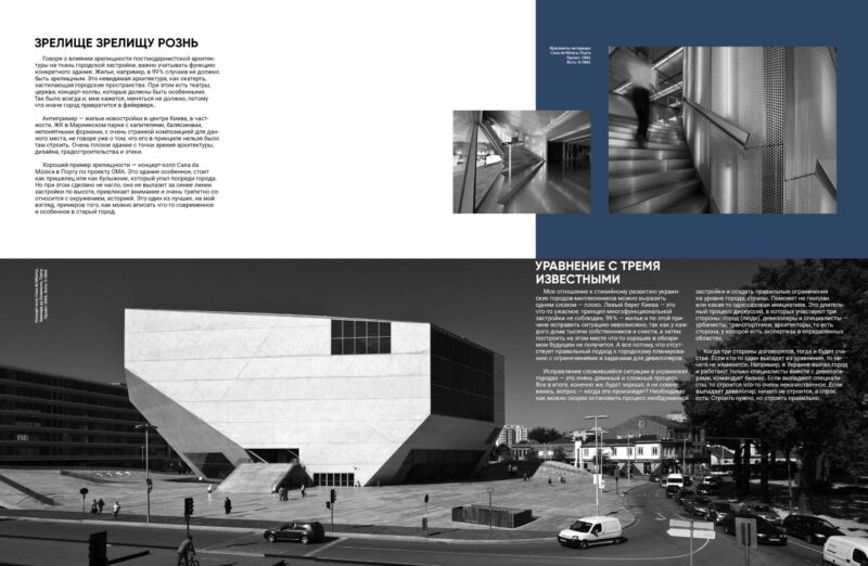 Говорячи про вплив видовищності постмодерної архітектури на тканину міської забудови, важливо враховувати функцію конкретної будівлі. Житло, наприклад, у 99% випадків не має бути видовищним. Це невидима архітектура, як скатертина, що застилає міські простори. При цьому є театри, церкви, концерт-холи, які мають бути особливими. Так було завжди і, мені здається, змінюватися не повинно, бо інакше місто перетвориться на феєрверк.