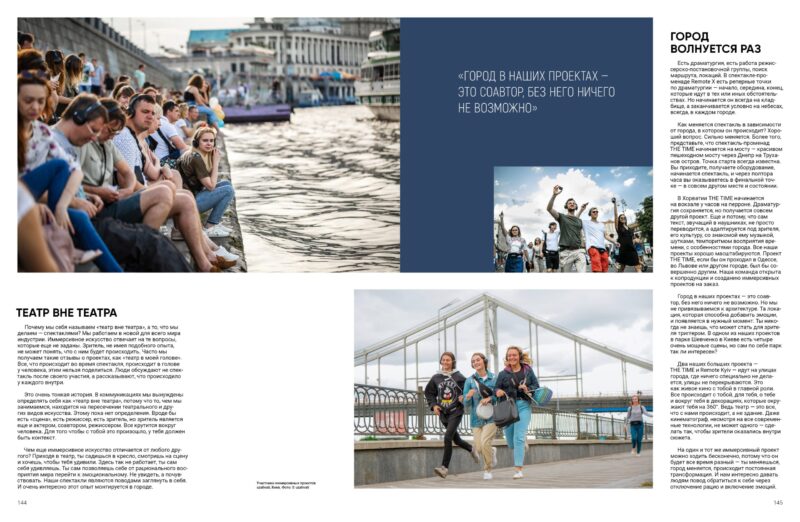 Два наші великі проєкти — THE TIME і Remote Kyiv — йдуть на вулицях міста, де нічого спеціально не робиться, вулиці не перекриваються. Це як живе кіно з тобою в головній ролі. Все відбувається з тобою, для тебе, про тебе та навколо тебе в декораціях, які оточують тебе на 360°. Адже театр — це все, що з нами відбувається, а не будівля. Навіть кінематограф, незважаючи на всі сучасні технології, не може одного — зробити так, щоб глядачі опинилися всередині сюжету.