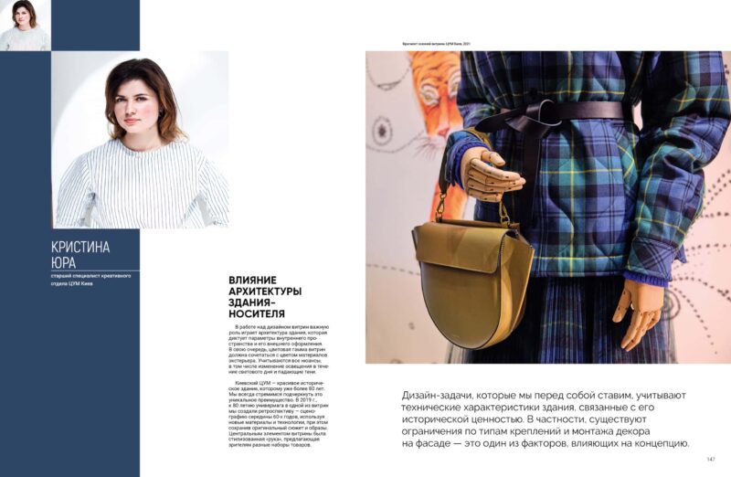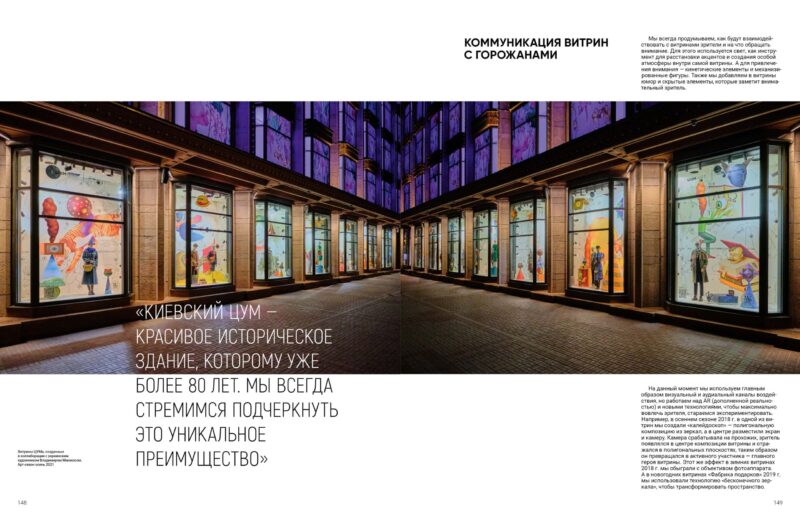 Київський ЦУМ — гарна історична будівля, якій уже понад 80 років. Ми завжди прагнемо підкреслити цю унікальну перевагу. У 2019 р., до 80-річчя універмагу, в одній із вітрин ми створили ретроспективу — сценографію середини 60-х років, використовуючи нові матеріали й технології, при цьому зберігши оригінальний сюжет і образи. Центральним елементом вітрини була стилізована «рука», що пропонує глядачам різні набори товарів.