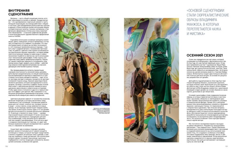 Вітрини — частина загальної концепції сезону, яка транслюється онлайн і офлайн. Кожна вітрина — це окремий елемент і частина великої композиції, ми завжди працюємо із загальним і приватним. Для об’єднання різносюжетних вітрин у єдину стилістичну лінію використовуємо загальну колористичну палітру, техніки, матеріали та графічне оформлення. У цьому мені дуже допомагає моя освіта: я вивчала графічний дизайн і закінчила факультет художнього оформлення книги в НАОМА.