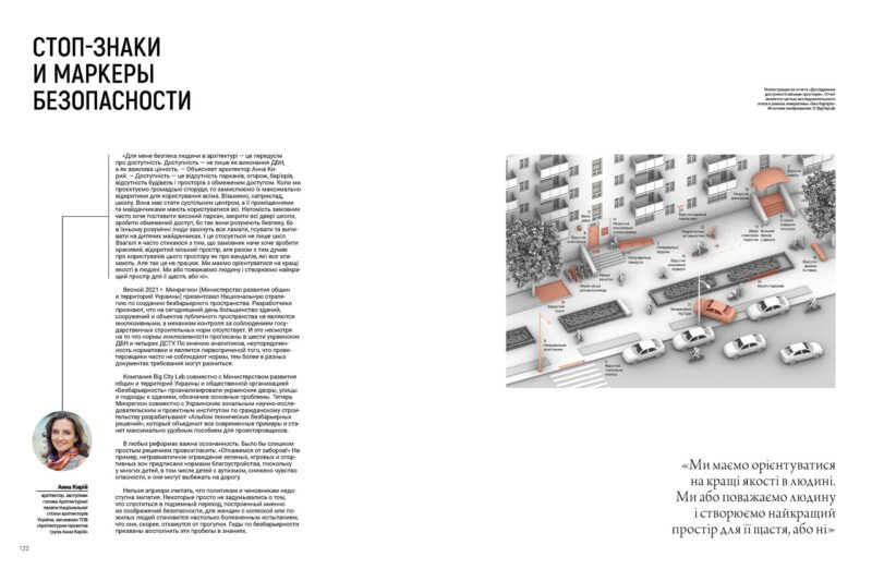 Компанія Big City Lab спільно з Міністерством розвитку громад і територій України та громадською організацією «Безбар’єрність» проаналізували українські двори, вулиці та підходи до будівель, позначивши основні проблеми. Тепер Мінрегіон спільно з Українським зональним науково-дослідним і проєктним інститутом із цивільного будівництва розробляють «Альбом технічних безбар’єрних рішень», який поєднає всі сучасні приклади та стане максимально зручним посібником для проєктувальників.