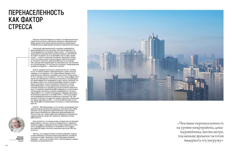 «Чим вища перенаселеність на рівні мікрорайону, будинку-мурашника, вагона метро, тим менше часу ти готовий витримати це навантаження. Наші вулиці — це візуально засмічений простір: реклама, вивіски, автомобілі не лише на дорозі, а й на тротуарах; щось гуде, пищить, блимає — і все це відволікає.
