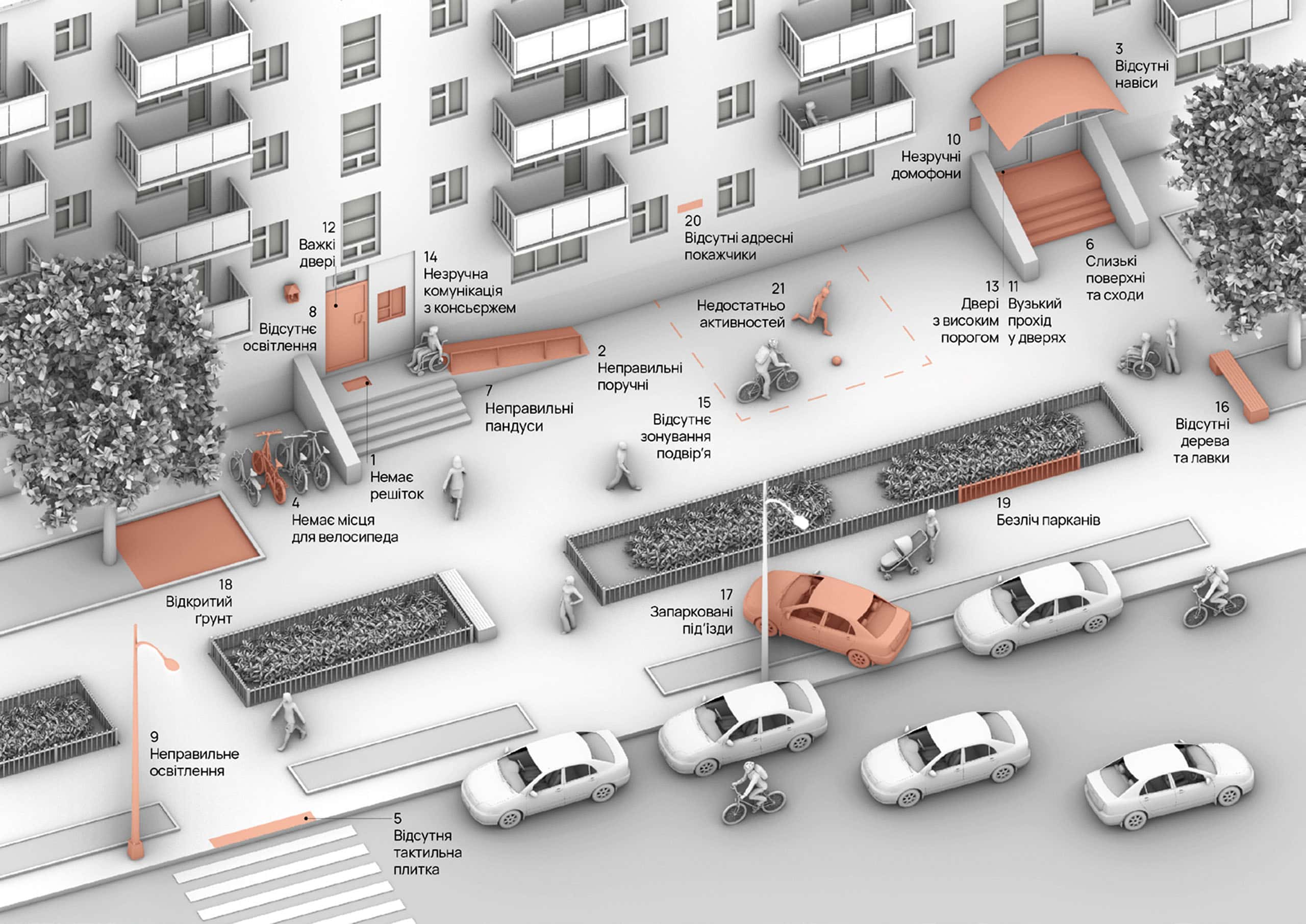 Ілюстрація зі звіту «Дослідження доступності міських просторів». Звіт є частиною дослідницького етапу в рамках ініціативи «Без бар’єрів». Джерело зображення: © BigCityLab