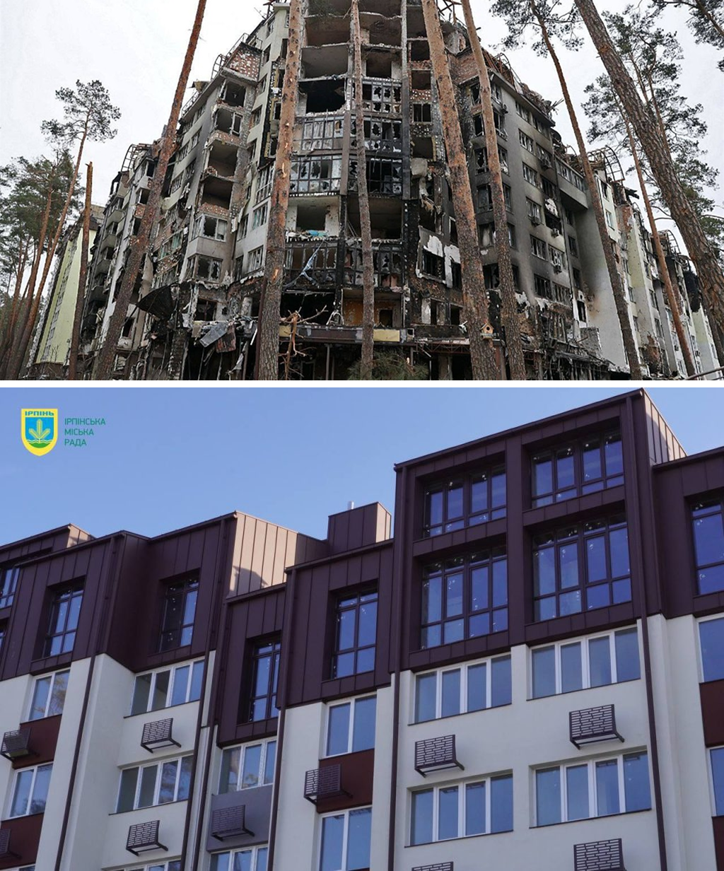 Житловий комплекс «Ірпінські Липки»: до та після відновлення. Джерело фото: офіційний сайт Ірпінської міської ради (imr.gov.ua)