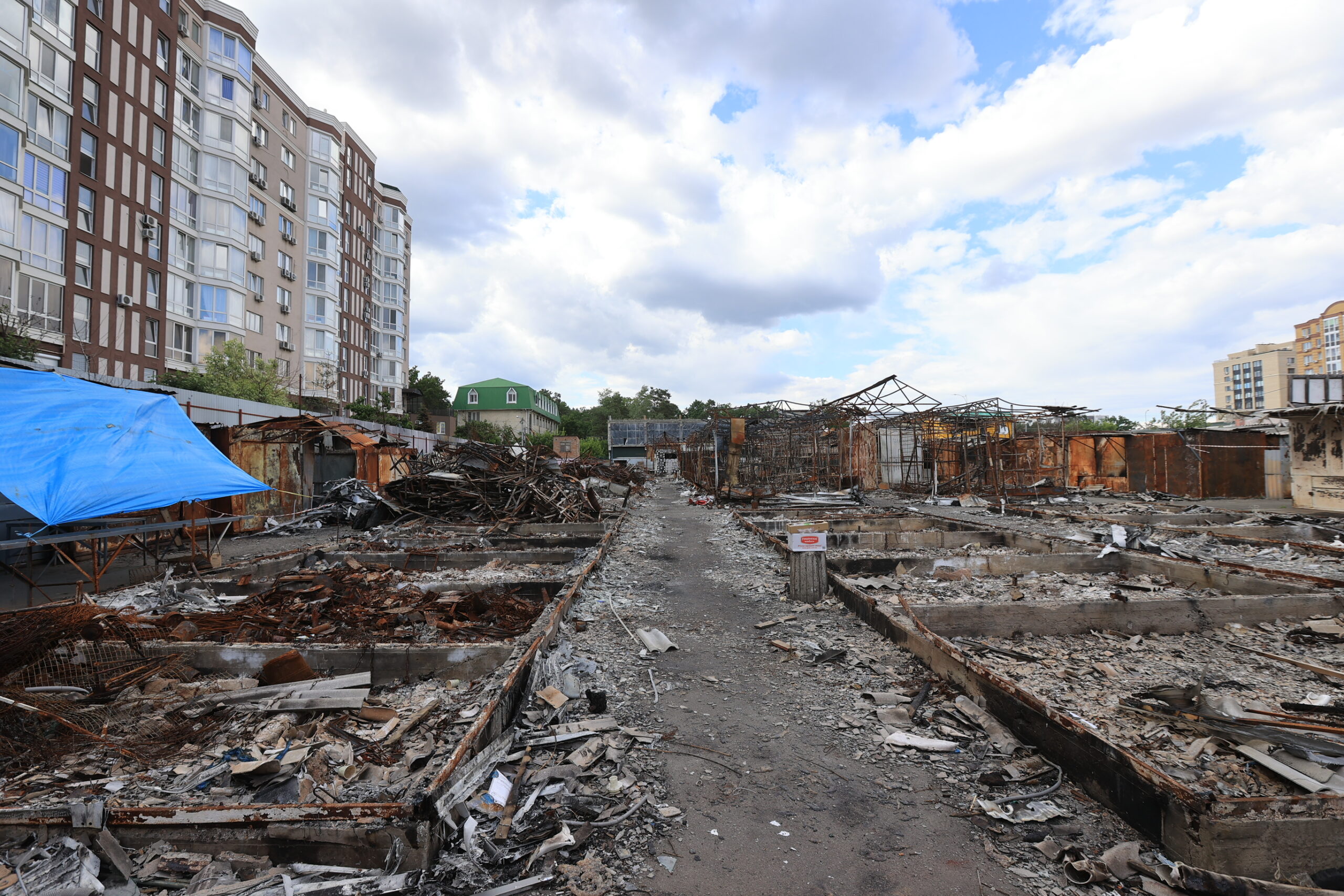 Все, що залишилося від торгових павільйонів старого ринку Ірпеня після атак російських окупантів. Джерело фото: Фонд відродження Ірпеня (irpinhelp.com)