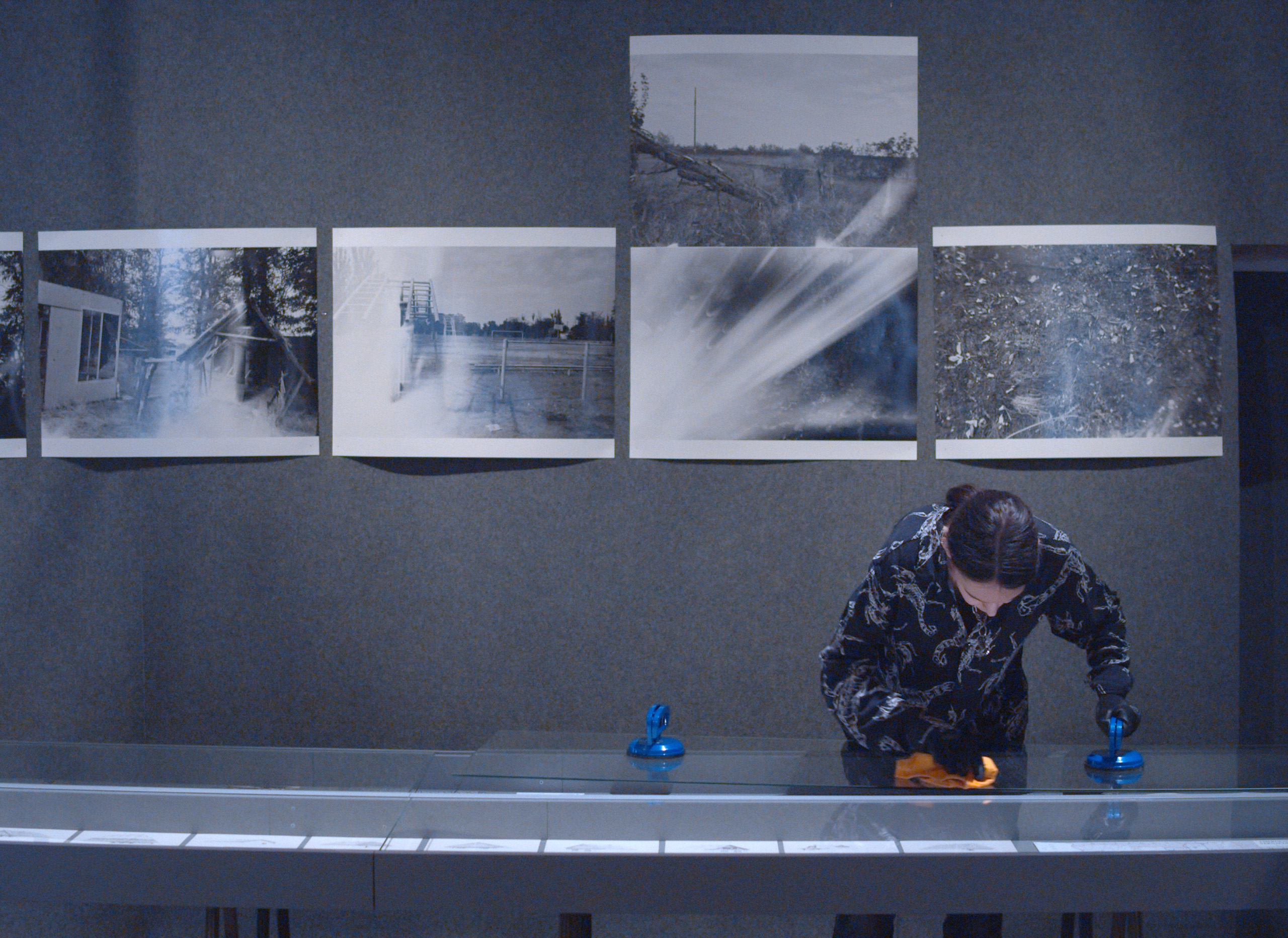 Богдана Косміна під час монтажу українського павільйону в Арсенале. На задньому плані — фотопроєкт «Місця» авторки Євгенії Бєлорусець. Фото: © Maxime Faure