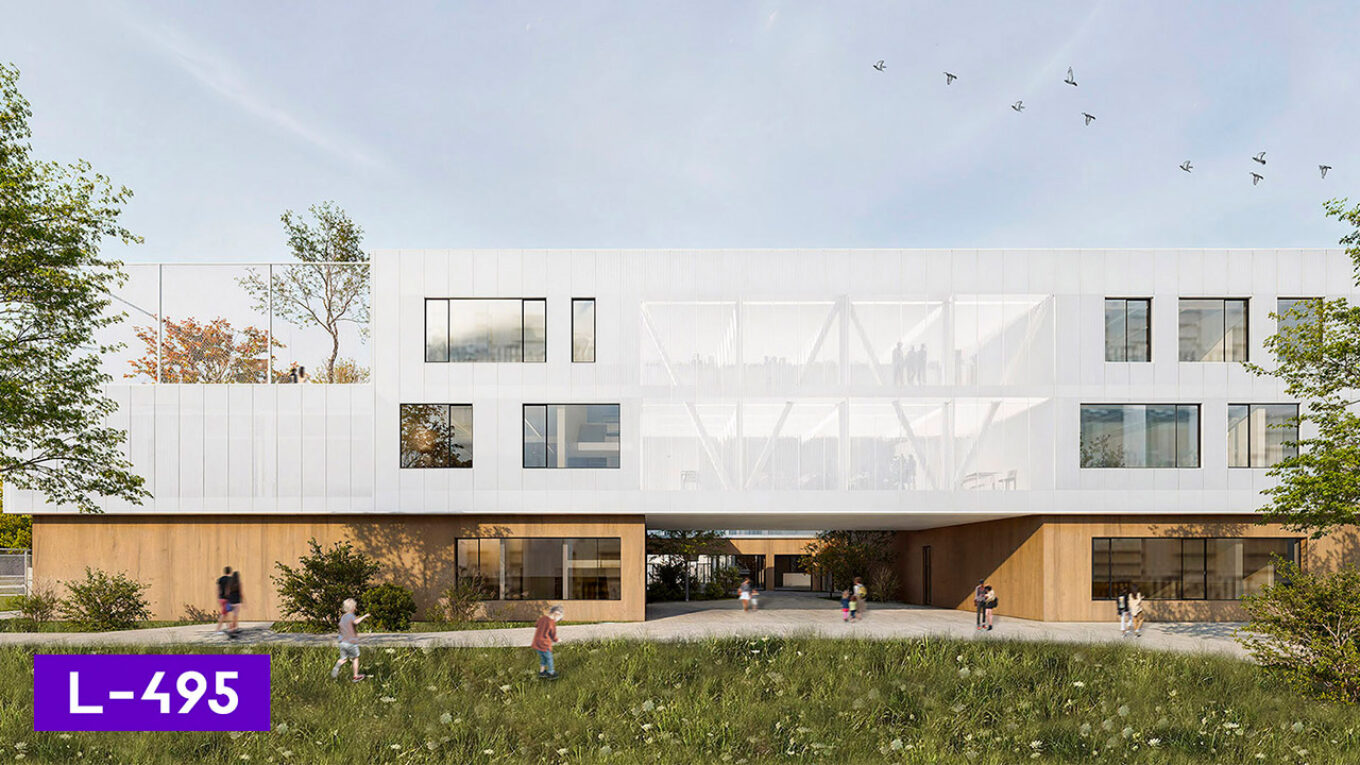 Рендер проєкту L-428. Для оздоблення фасадів автори використали сендвіч-панелі, HPL-панелі та полікарбонатні системи