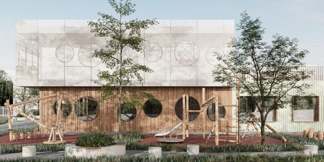 Учасники вирішили розділити потоки дітей молодшого та старшого віку й спроєктували школу та дитсадок як дві окремі будівлі. Територія довкола навчальних закладів насичена зонами активності: є відкритий багатофункціональний спортмайданчик, дитячі майданчики, три 100-метрові бігові доріжки та одна велика доріжка довкола школи на 360 метрів. У внутрішньому подвір’ї, між дитсадком та школою, спроєктували великий радіальний амфітеатр, який слугуватиме місцем для проведення заходів. На території навчальних закладів загалом передбачено майже 1000 кв. м зелених насаджень.