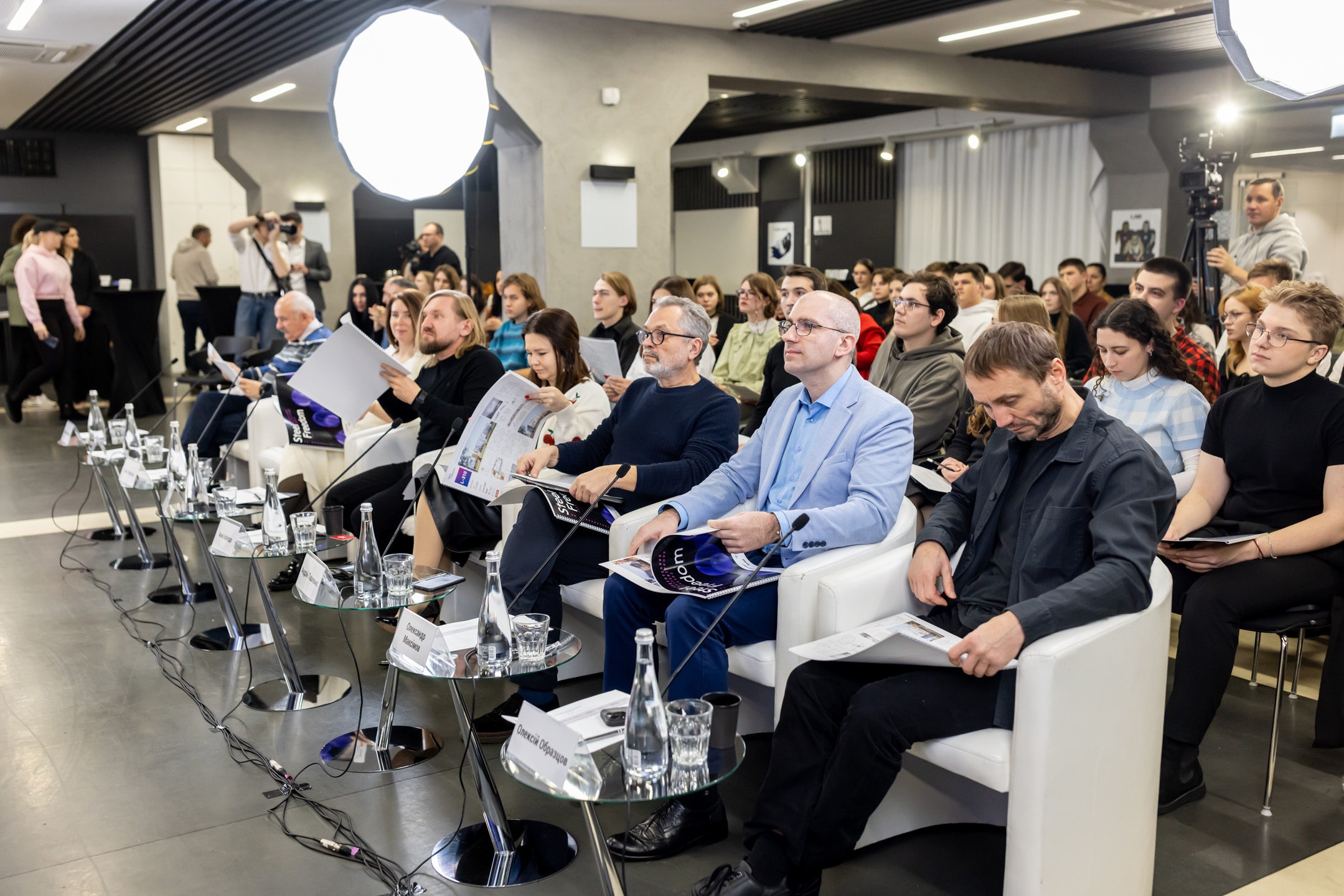 Журі конкурсу. Справа наліво: Олексій Образцов (ArchObraz), Олександр Максимов (AVG), Андрій Пашенько («А. Пашенько»), Анна Іскіердо (АІММ), Дмитро Васильєв (archimatika), Анна Лаєвська («Інтергал-Буд») та Василь Пасічник (Інститут ім. В. М. Шимановського)