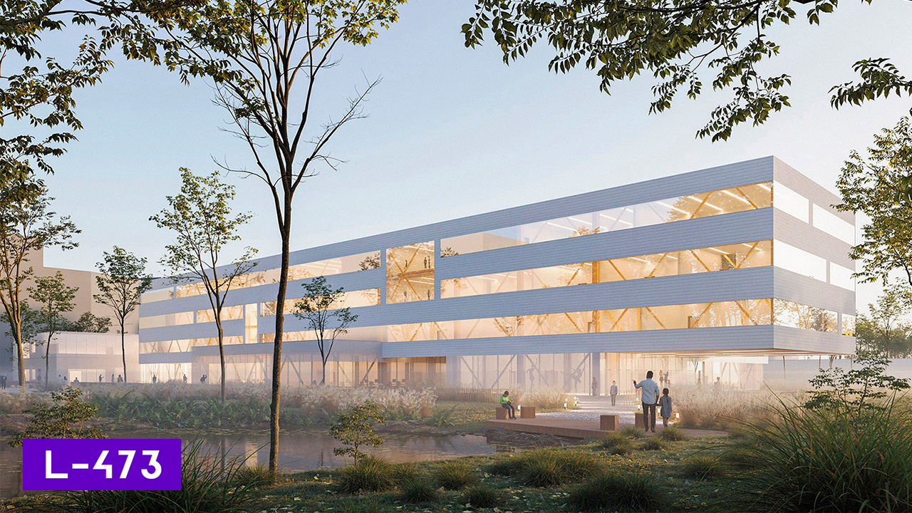 Рендер проєкту L-428. Для оздоблення фасадів автори використали сендвіч-панелі, HPL-панелі та полікарбонатні системи