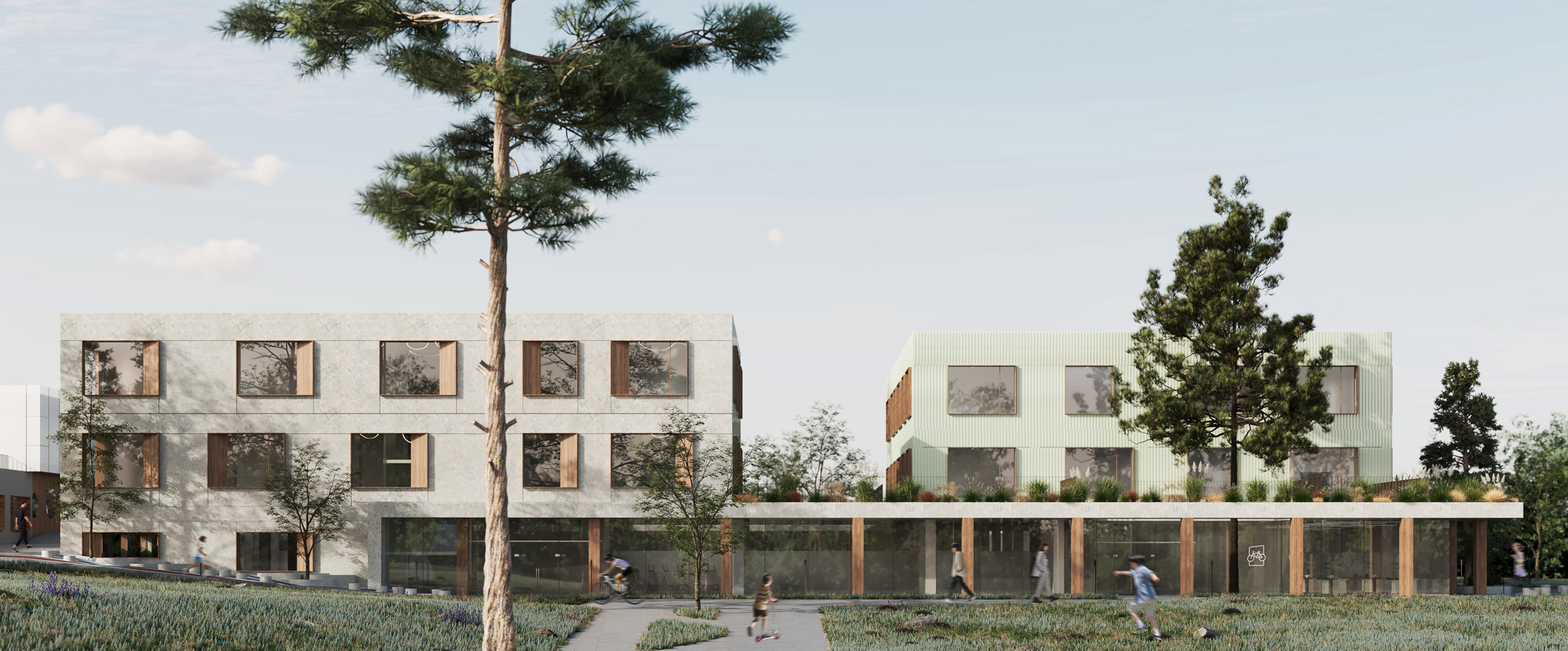 Т.К.: А ще ми взяли до уваги кейс Nord Architects — у них є дуже цікавий проєкт навчального закладу, який вони проєктували спільно з бюро COBE. Звідти ми перейняли підхід до розмежування потоків різних вікових груп. Ця ідея нас дуже захопила. Ми подумали, що, можливо, нам теж варто створити комфортний простір для кожної групи й навіть для кожної вікової категорії. Тобто в нас є зона і для підлітків, і для тих, кому 9–10 років, і для наймолодших дітей. Подібним чином ці зони сегментовані й на вулиці.