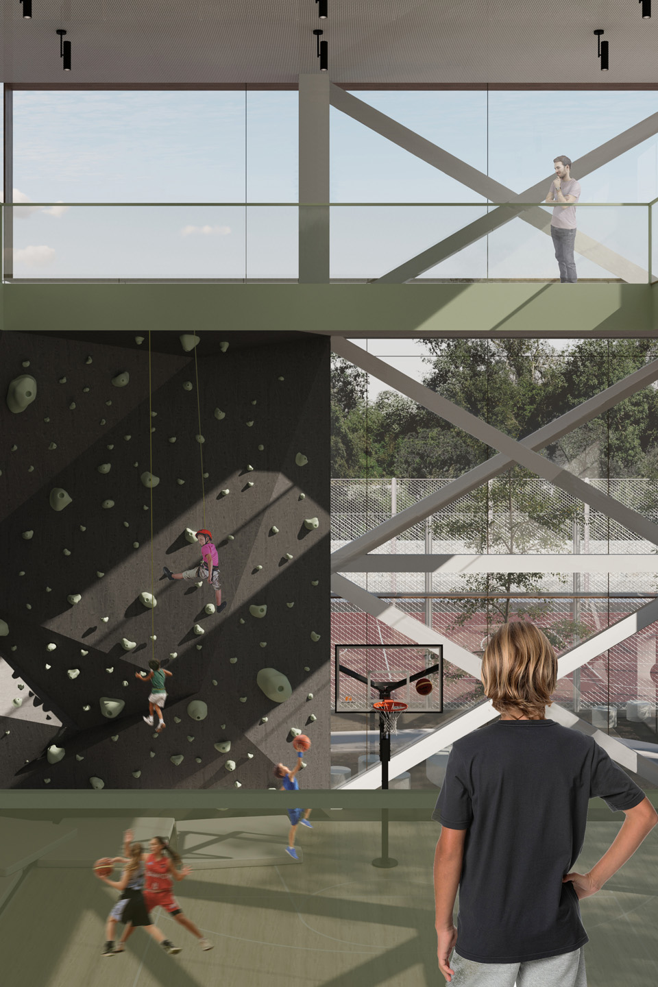 Г.С.: Мені в школі також не вистачало спортзалу — у нас були лише розбиті майданчики на вулиці. Тож ми передбачили гарний, великий трирівневий спортзал із трибунами на другому й третьому рівнях. Це, звісно ж, інклюзивний простір, куди зможуть приходити люди з інвалідністю, маломобільні тощо. Тереза запропонувала басейн, я та Сергій — скелелазну стінку. Звісно, це доволі дорогі види спорту, і реалізація стінки для альпінізму може виявитись надто дорогим рішенням для забудовника. Але наш проєкт адаптивний: те, що не впишеться в бюджет, можна буде прибрати. Насправді в просторі школи ми передбачали багато площ, які можуть у майбутньому слугувати як комерційні. Умовно басейн до обіду працює в межах уроків фізкультури, а після обіду ним користуються мешканці мікрорайону. І таких приміщень дуже багато: той самий амфітеатр, актова зала, скелелазна стінка — всі ці приміщення можна адаптувати під комерційне використання.