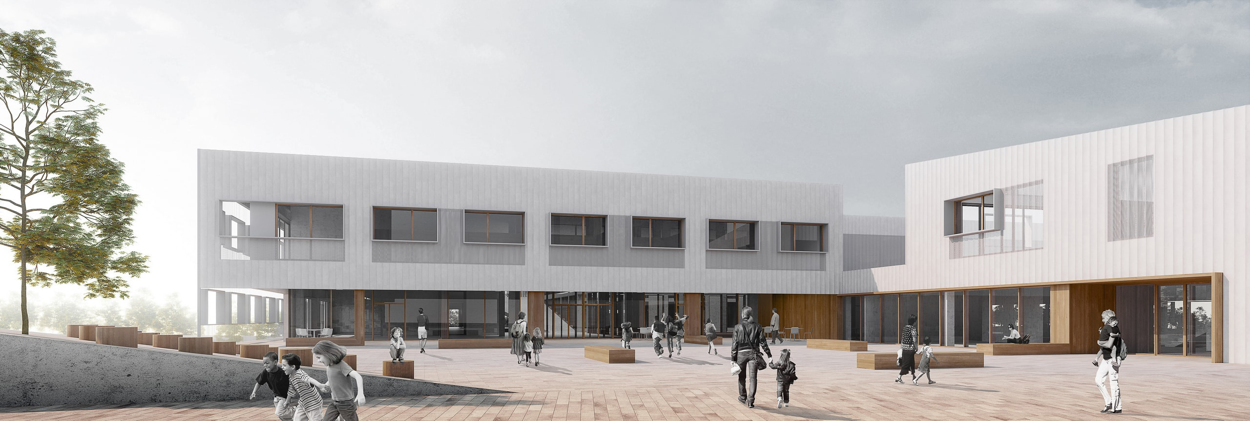 Згідно з конкурсним завданням, школу з дитсадком треба було гармонійно вписати в житловий район Львова, який зараз активно розбудовується. У проєктній пропозиції переможців громадська зона школи поступово розчиняється в просторі парку, а сусідня спортивна зона також об’єднується з міським середовищем. «Таким чином ми формуємо активний громадський центр району, куди будуть тяжіти як школярі, так і місцеві жителі», — відзначили автори проєкту.