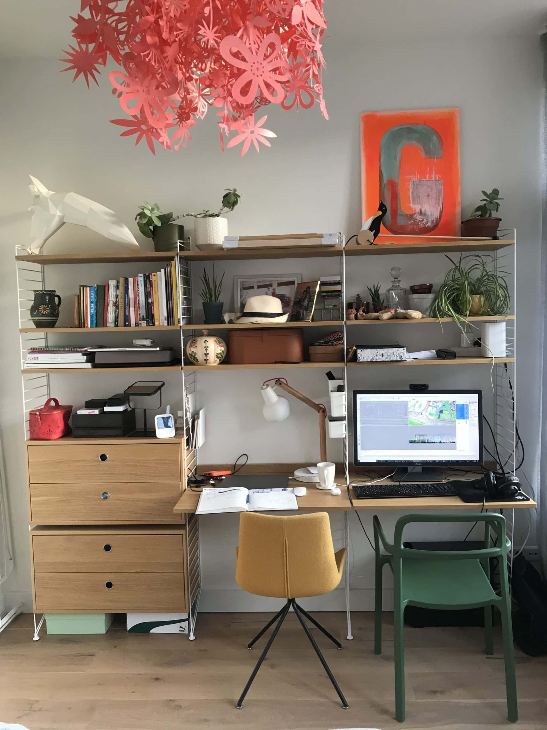 Спеціальної кімнати під кабінет ми в нашому будинку ніколи не планували. І взагалі ніколи не хотіли переносити додому робочий процес. Будинок — місце для відпочинку. У загальному просторі нашого будинку є величезний «ком’юніті»-стіл, який об’єднує всіх нас. Тому, недовго думаючи, ми додали цьому столу ще одну функцію — кабінет (докладніше про будинок дизайнерів зі SVOYA studio читайте тут).