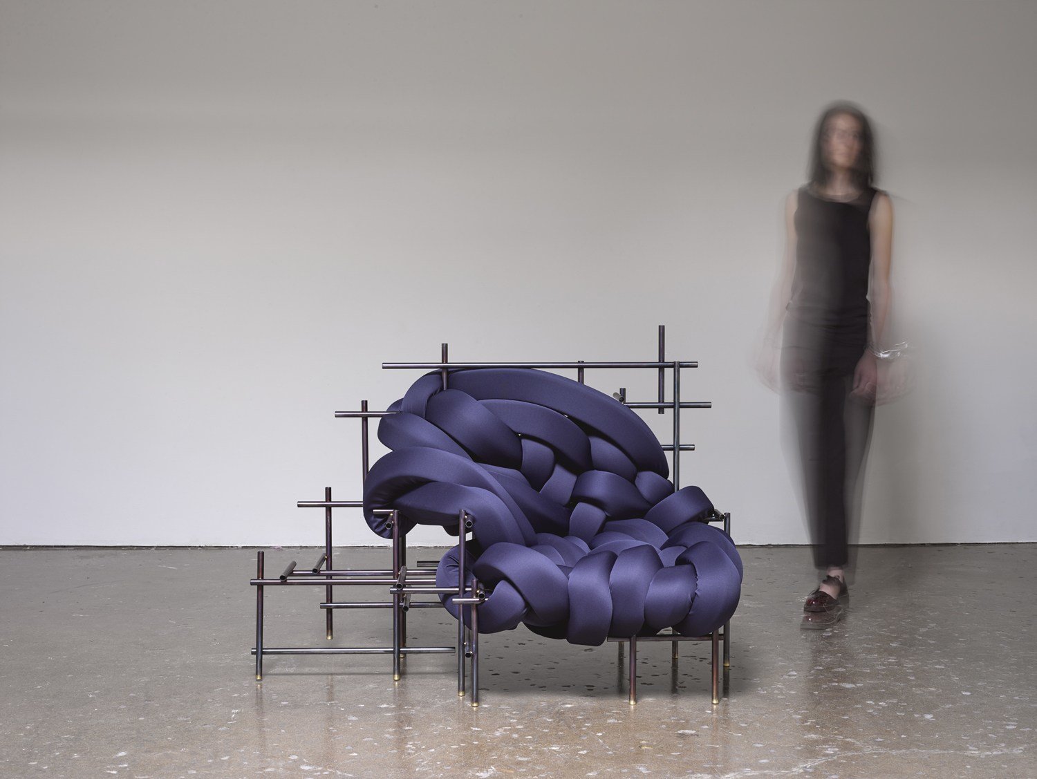 Металлические трубы, сваренные в рандомном порядке, образуют уникальную хаотичную структуру, агрессию которой смягчают плетенные из полиуретановой пены полосы в неопреновой оболочке.