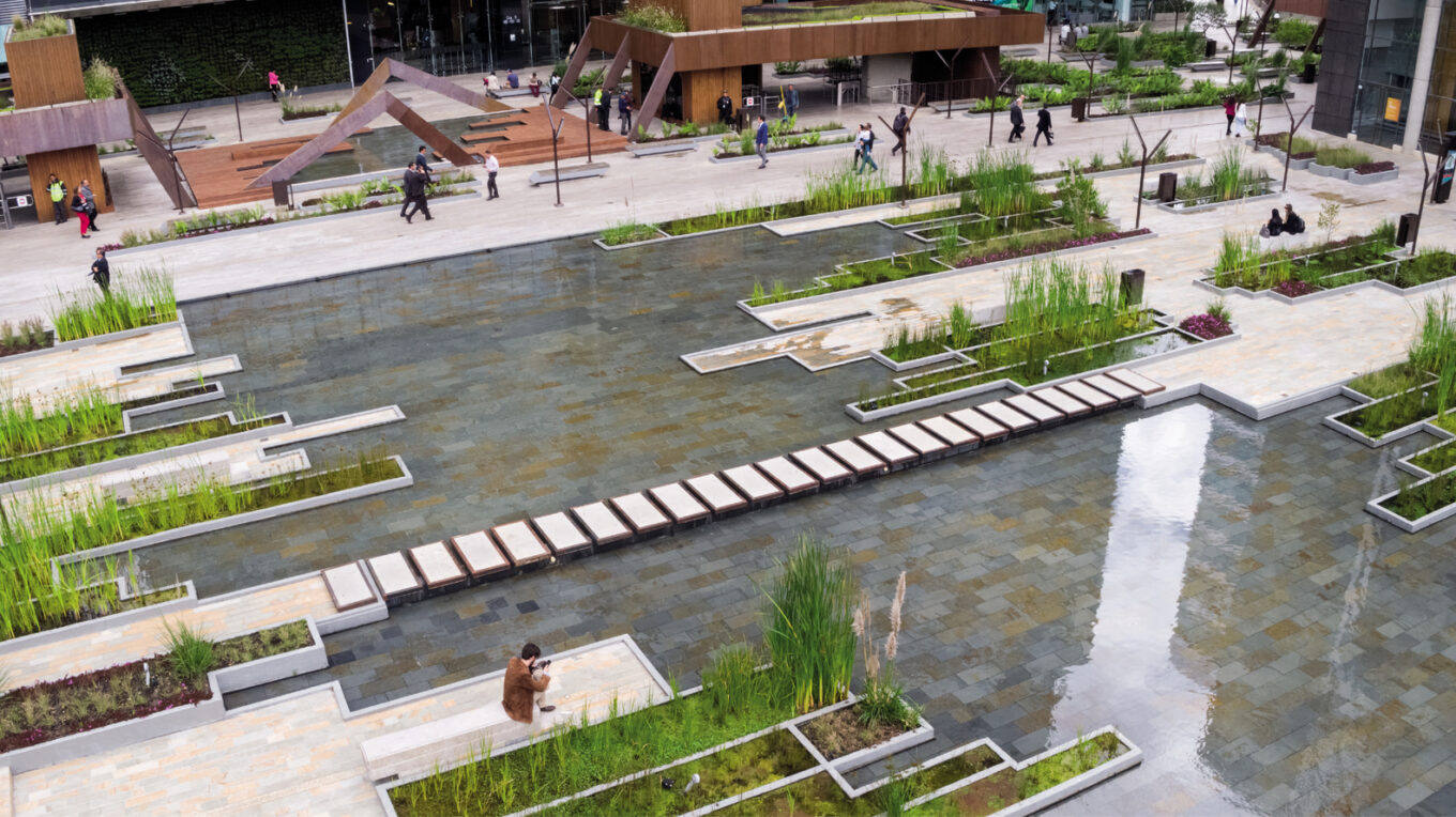 По-друге, болото — це престижно. Суто міська інтерпретація лугового болотного пейзажу — це площа в бізнес-центрі колумбійської Боготи, перетворена архітекторами студії Obraestudio. Вони надихалися водно-болотними угіддями боготської савани. Дикі болотяні трави контрастують із регламентованою геометрією лінійних водойм, наповнених очищеною дощовою водою, що створює ефектний ландшафт. Слід зазначити, що цей ландшафт має дуже дорогий і престижний вигляд, наголошуючи на статусі фінансових веж по периметру площі.