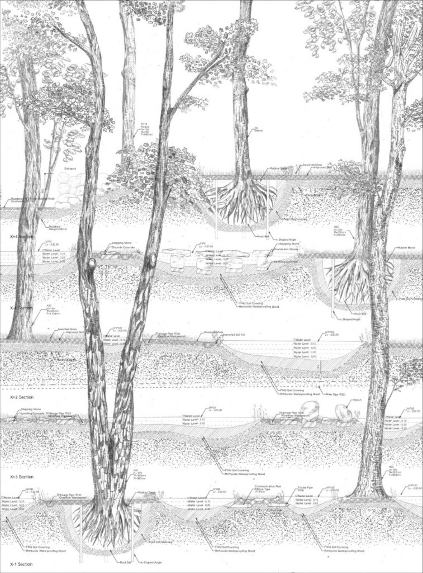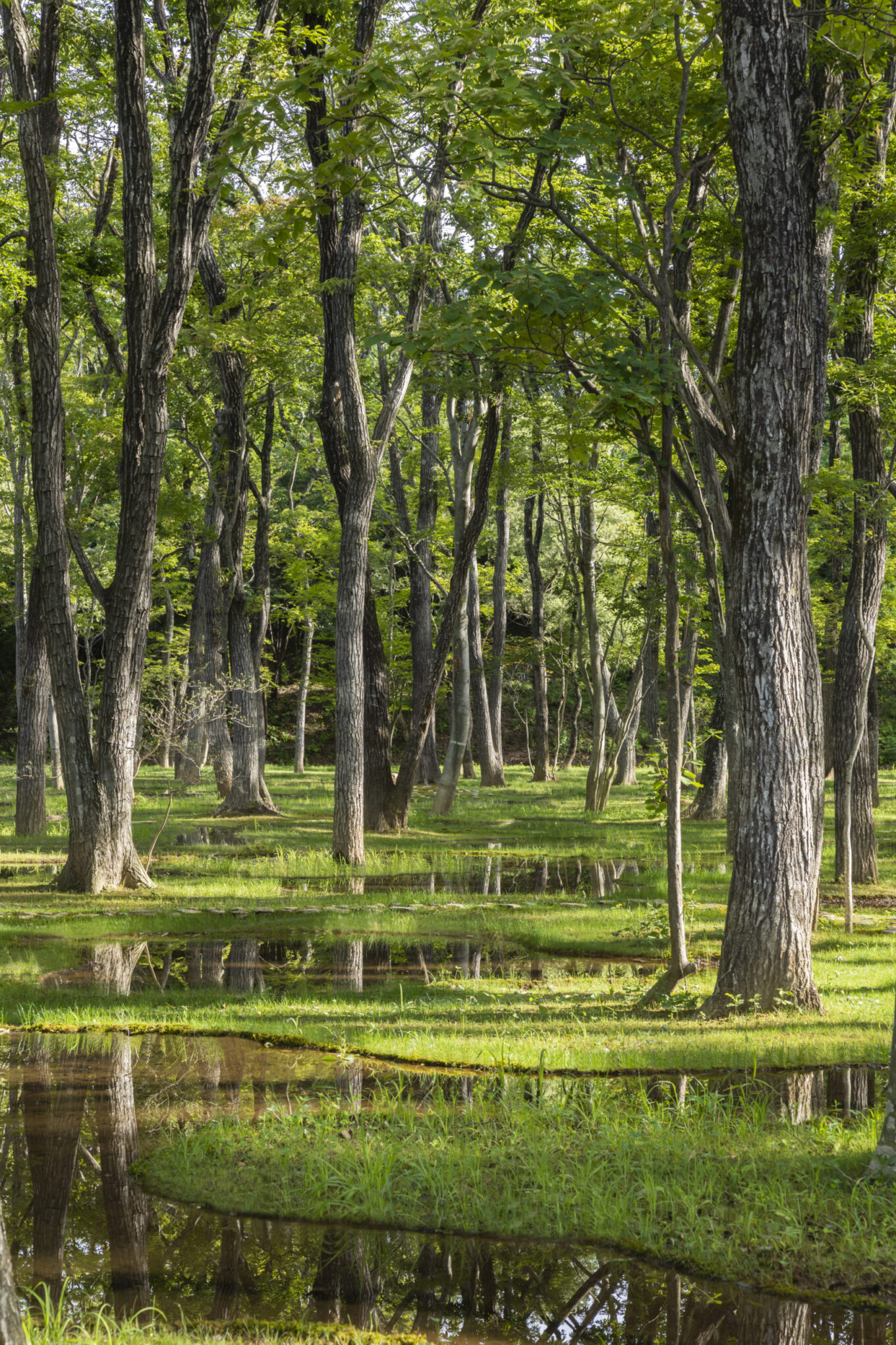 Він пересадив на колишнє рисове поле дерева з ділянки, відведеної під забудову. А між замшілими стовбурами створив мереживо струмків із болотними рослинами. Рівень води регулюється системою шлюзів. Безумовно, це штучний, артистичний ландшафт — компіляція природної краси та фантазії людини. Але він нагадує нам про таке диво, як природне лісове болото.