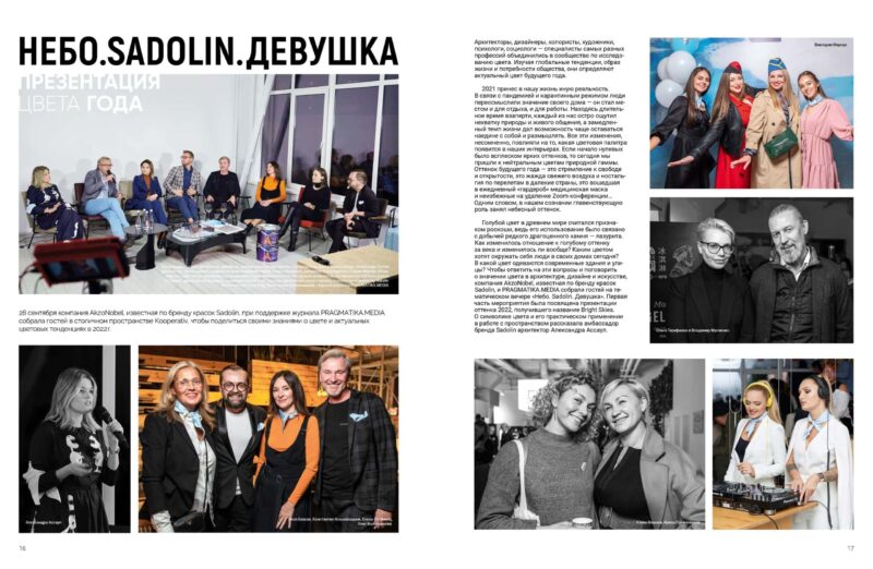 Щоб відповісти на ці запитання та поговорити про значення кольору в архітектурі, дизайні та мистецтві, компанія AkzoNobel, відома за брендом фарб Sadolin, і PRAGMATIKA.MEDIA зібрали гостей на тематичному вечорі «Небо. Sadolin. Дівчина». Перша частина заходу була присвячена презентації відтінку 2022 року, який отримав назву Bright Skies.