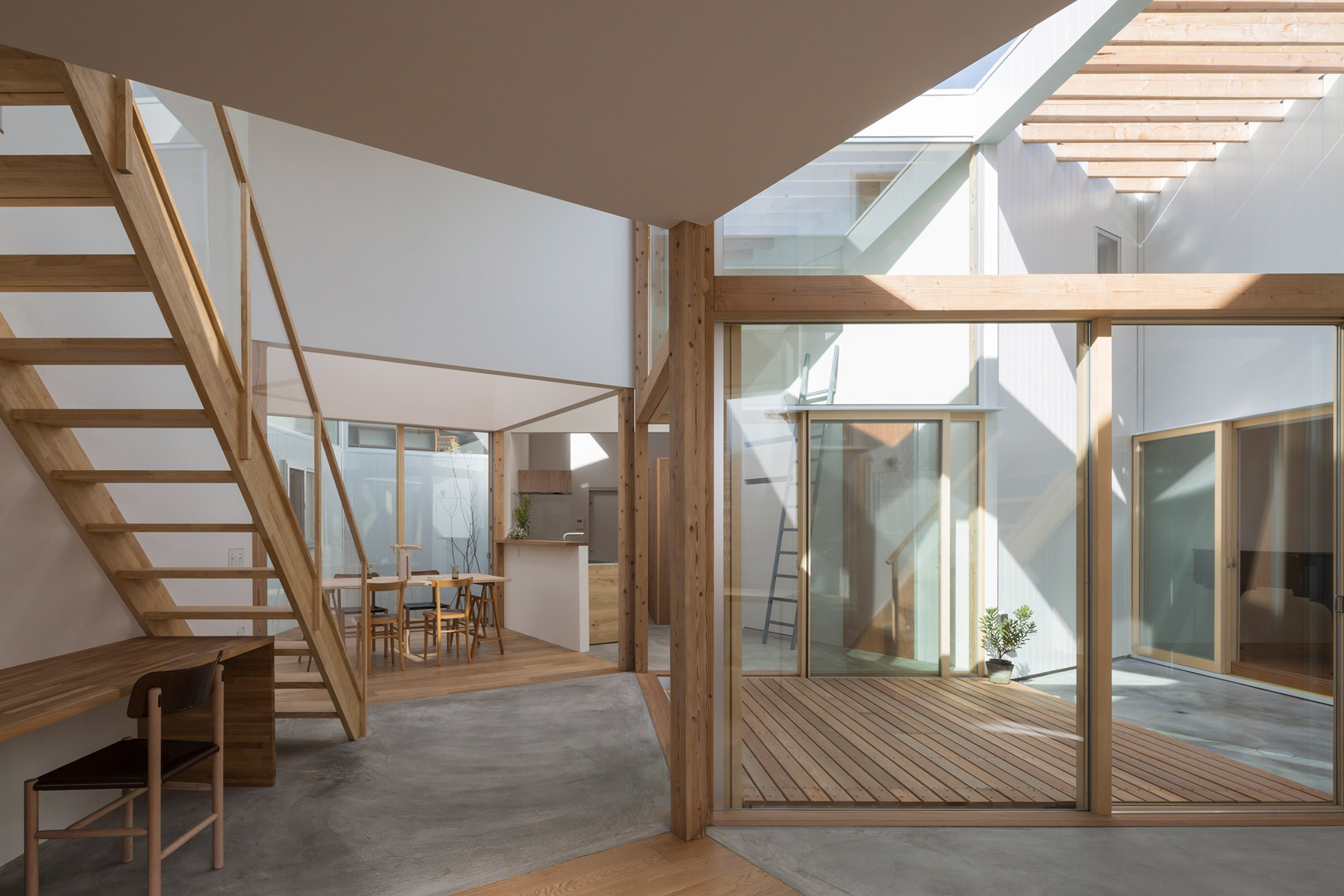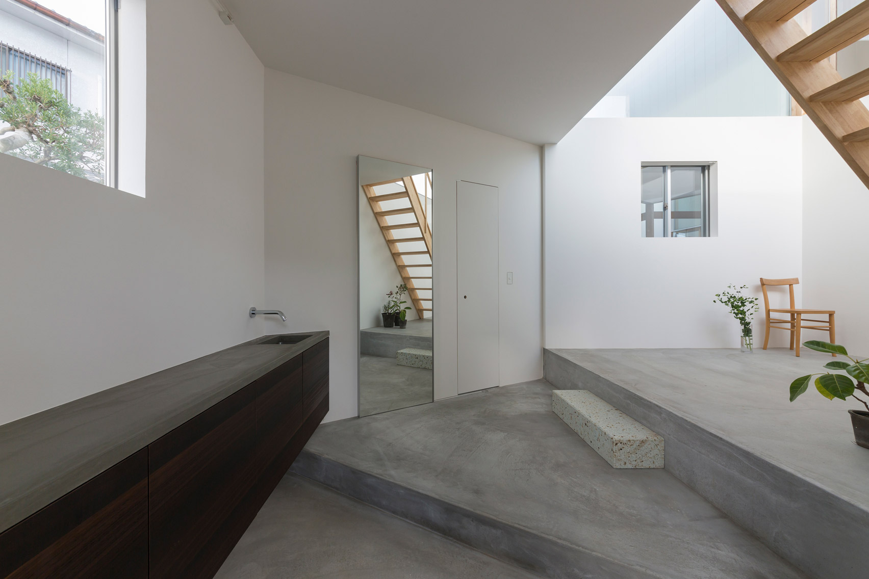 Дом расположен в густонаселенном жилом районе, поэтому имеет закрытый фасад, который обеспечивает жителям приватность. При этом в здании предусмотрены три внутренних дворика, которые позволяют дневному свету проникать вглубь комнат. Световой фонарь на крыше и большие окна на первом этаже также гарантируют хорошее естественное освещение.