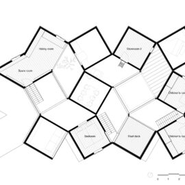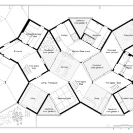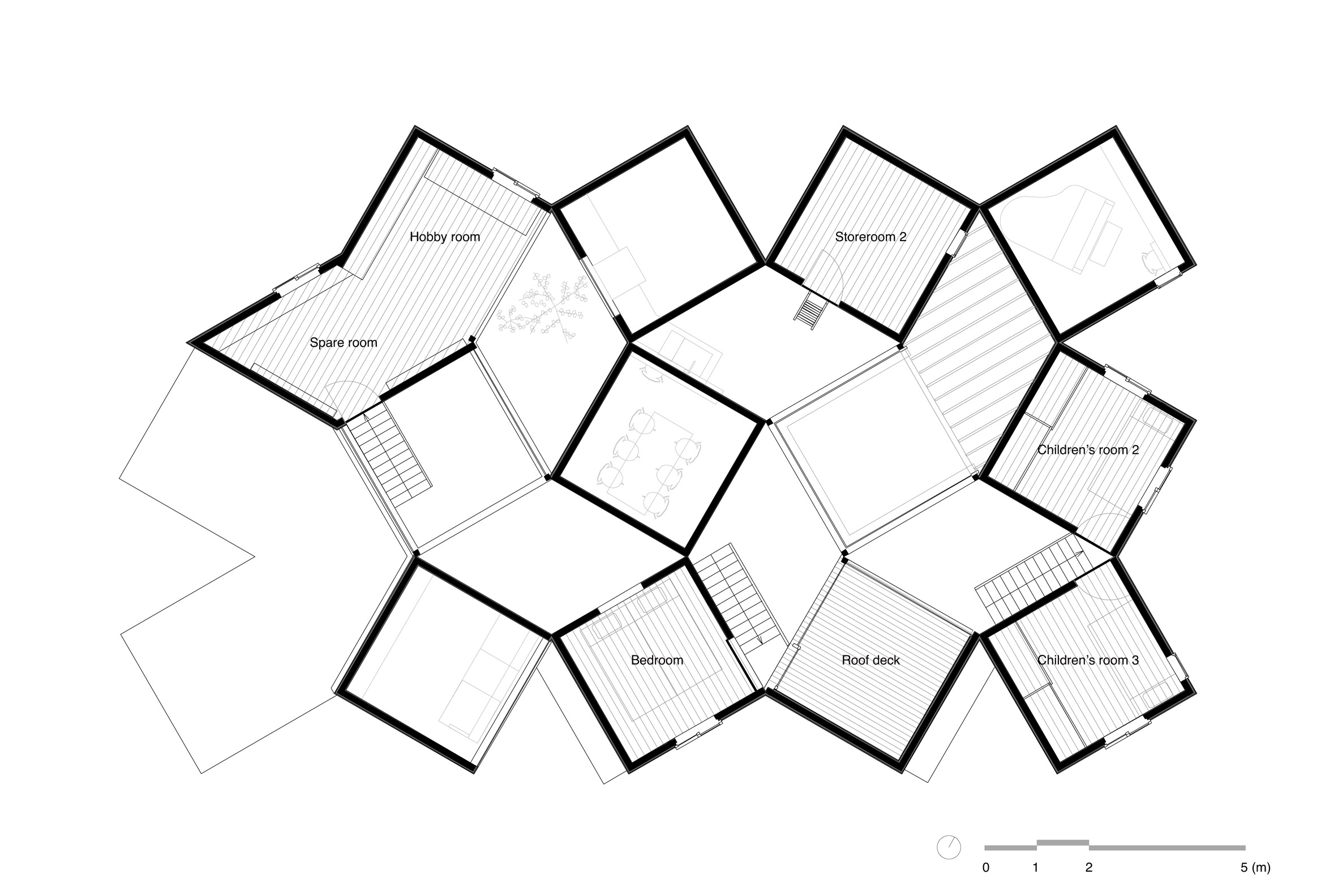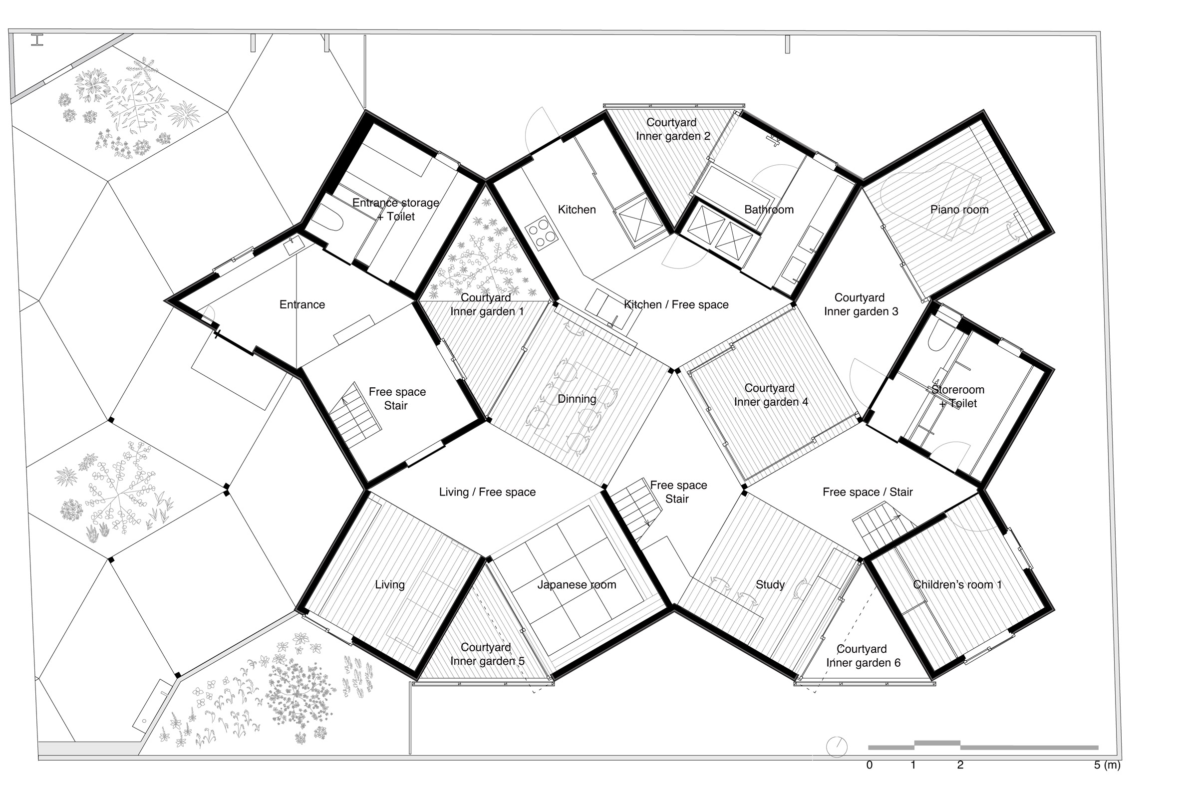 Вместо того, чтобы придерживаться правильного прямоугольного плана этажа, Симада разработал своеобразный «лабиринт» из 12 квадратов, соединенными ромбами. Двенадцать комнат на первом этаже и еще шесть на втором перемежаются с многоцелевыми общественными зонами. Такая планировка позволяет жильцам прокладывать разные маршруты и приспосабливать пространства к изменениям в образе жизни.