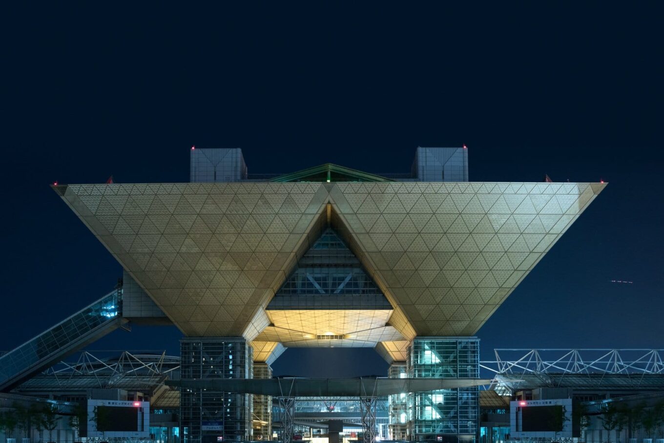 Tokyo Big Sight – здание международного выставочного центра, открывшееся в 1996 году. 58-метровая восьмиэтажная башня в форме четырех перевернутых пирамид была спроектирована архитекторами японского бюро AXS Satow