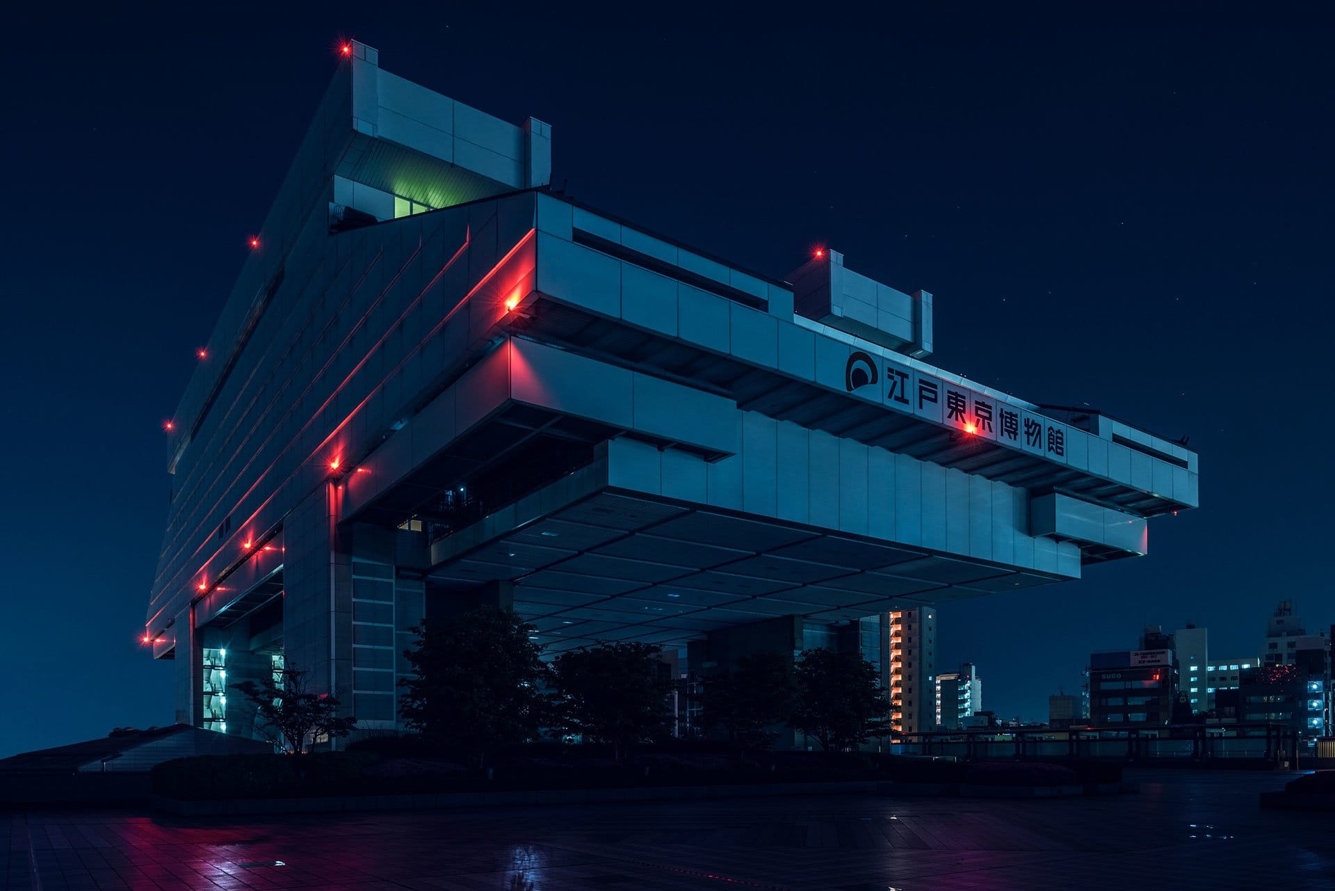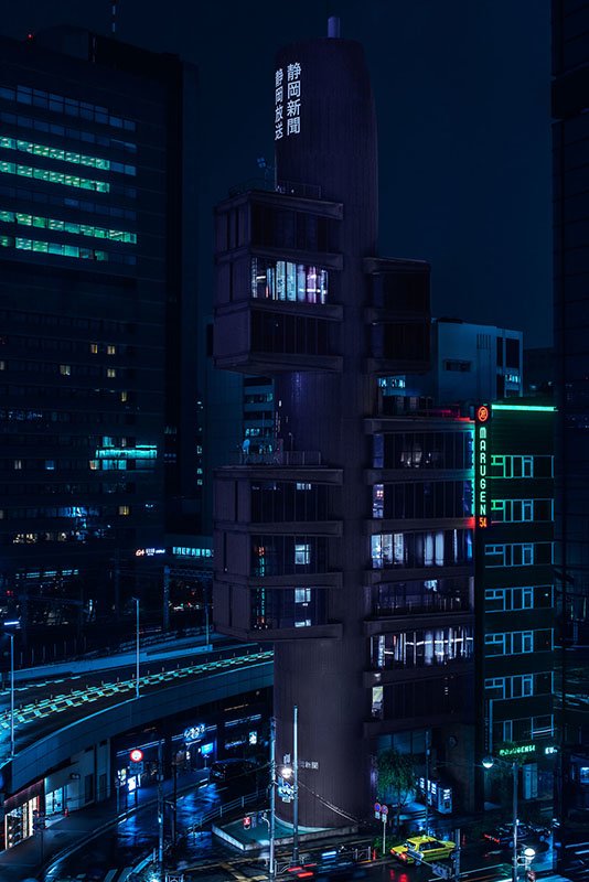 Его работы – это взаимопроникновение эстетики стилей нуар и киберпанка, где тревожный неоновый свет обрисовывает токийские лэндмарки: штаб-квартиру Fuji TV Кензо Танге, капсулу Накагина Кисё Курокавы, Пламя Асахи Филиппа Старка, Новое небо Йоджи Ватанабе, Музей Эдо Кионори Кикутаке и другие.