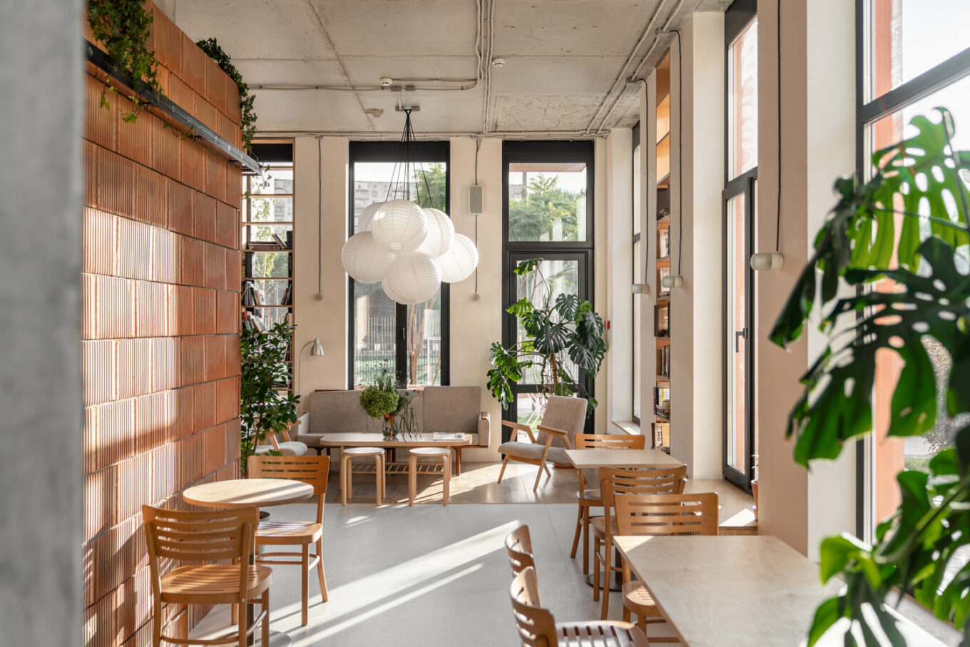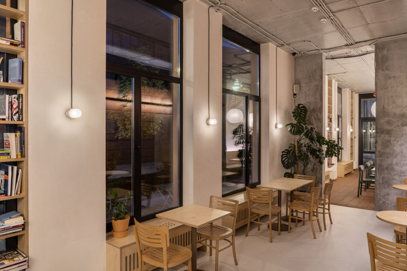 Café 128 CT – перший заклад однойменної мережі кав’ярень, розташований на лівому березі Києва. Довгий фасад, збагачений високими вікнами, через які проникає тепле західне сонячне світло, дозволив знайти незвичайні рішення щодо текстур і матеріалів. Так, в цьому проєкті з’явилися: керамічні блоки, клінкерна цегла, керамічні бра, які використовуються в гарячих лазнях, піщана штукатурка, тепла фанера, натуральний лінолеум пісочного кольору, що мав зменшити відлуння і зберегти теплоту простору.